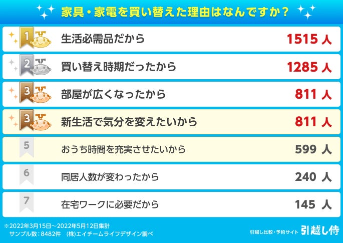 多くが「必要なものを揃える」というニュアンスが強い理由ですが、一方で、3位の「気分を変えたい」や5位の「おうち時間を充実させたい」などインテリア目線での理由を回答した人も1400人以上いるという結果となりました。
