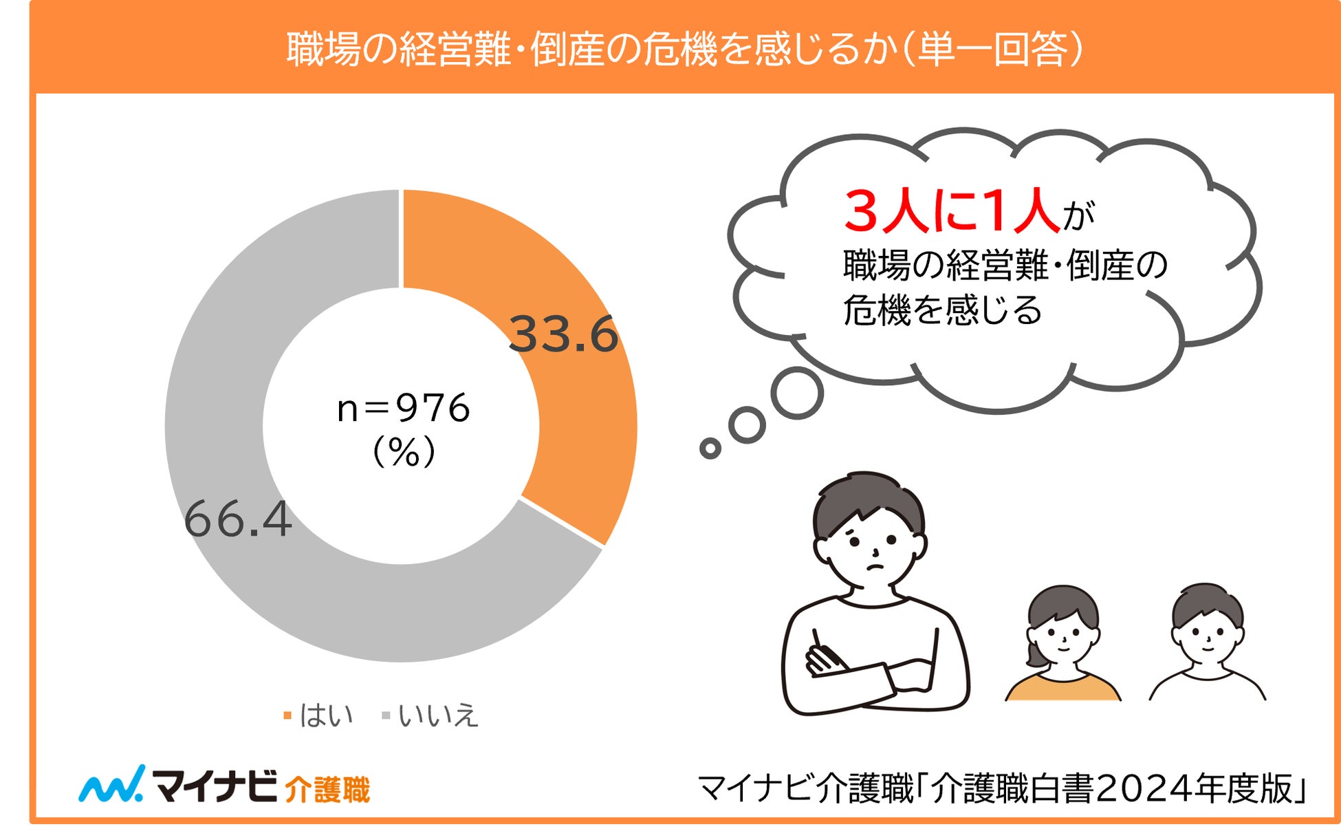 介護職の5割が「年収300万円未満」。「処遇改善の対応があった」は6割で、前年比8.1pt増。3人に1人が職場の経営難・倒産の危機を感じる