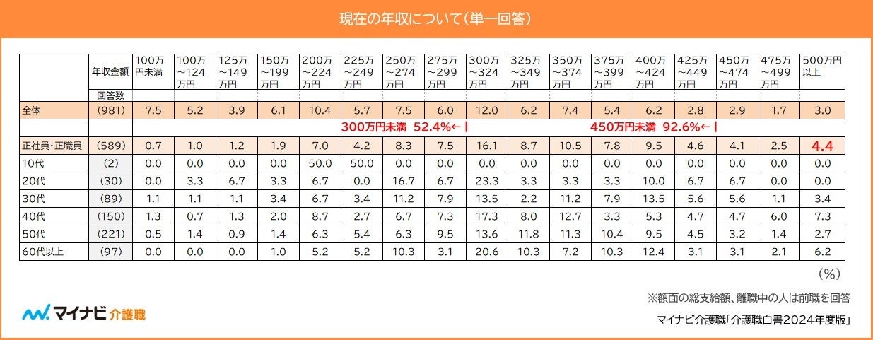 現在の年収を聞いたところ、52.4%が年収300万円未満だった。国税庁によると給与所得者の平均給与は460万円とされているが※1、介護職では92.6%が年収450万円未満であった。また正社員・正職員の平均給与は530万円とされているが※1、介護職では年収「500万円以上」は4.4%だった。【図1】