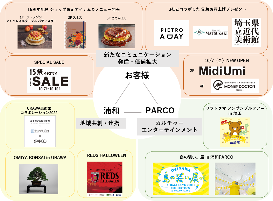 浦和にオープンして15年。浦和の街が大好きなPARCOと市民、企業、商店街の方々とともに、街と共存する商業施設を目指します。15周年の考え方として、浦和PARCOでは下記3つのテーマを軸に展開してまいります。