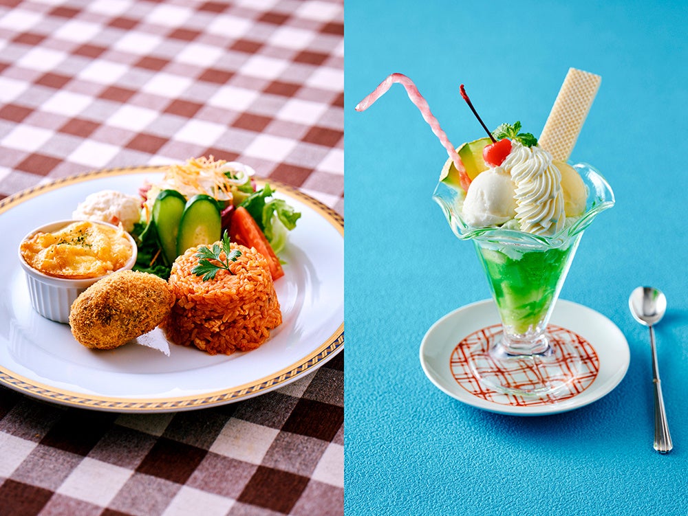 シーフードマカロニグラタン、牛肉コロッケ、チキンライスを一皿に揃え、大人のお子様ランチをテーマに考案された「なつかしバラエティプレート」。ボリューム満点で、懐かしさと満足感をお届けします。さらに、別途料金でエビフライを追加することもでき、より豪華なごちそう気分をお楽しみいただけます。レトロなメロンクリームソーダをパフェ仕立てにした「クリームソーダパフェ」は、爽やかなソーダゼリーとアイスクリームの上に、真っ赤なサクランボをトッピングした、パティシエの遊び心が光るデザートです。