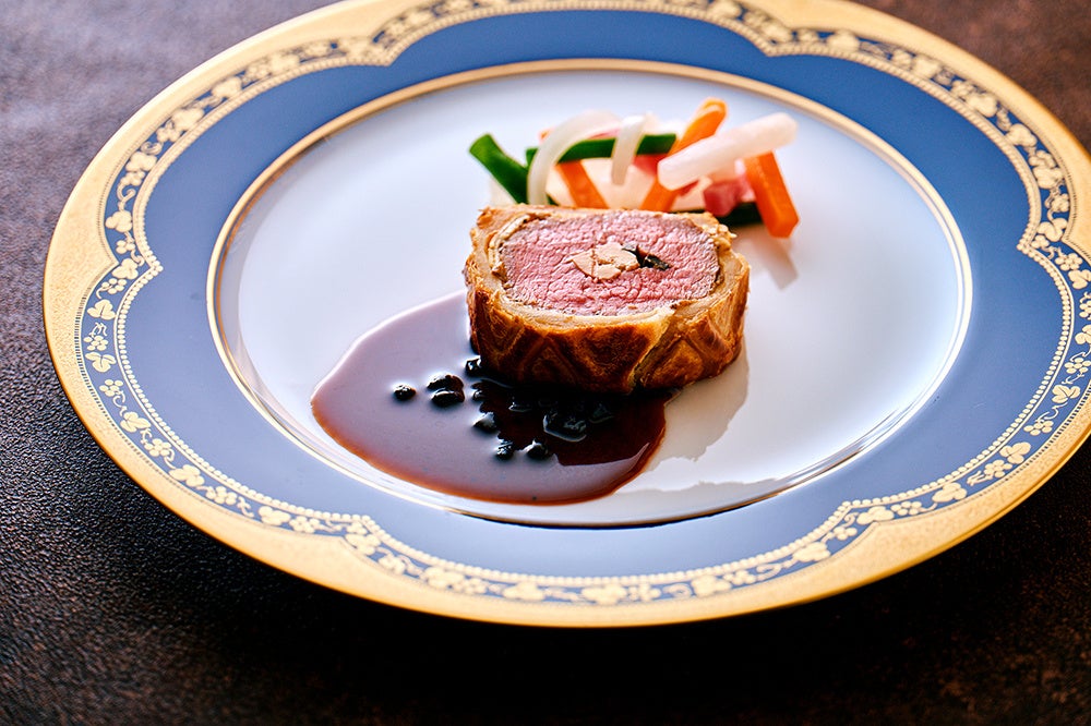 記念コースの「ムニュ プレステージュ」をご用意。伝統と革新をテーマした月替わりのコース料理をお楽しみください。11月は「スカイレストラン ピトレスク」に受け継がれる伝統のコンソメスープや、和牛フィレ肉のパイ包み焼きなどクラシックメニューを中心に構成。12月は発酵食や和の要素を融合させた現代的なコースをご堪能いただけます。
