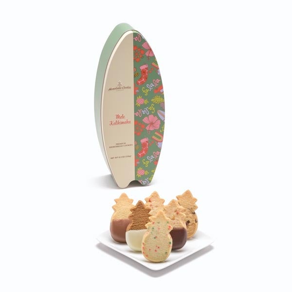 〈ホノルル・クッキー・カンパニー〉①メレ・ストッキング・ギフト缶 6枚入り 1,996円 ②メレ・ギフトボックス(L)24枚入り 5,400円 ③メレ・サーフボード・ギフト缶 15枚入り 3,996円/1階 MAP②