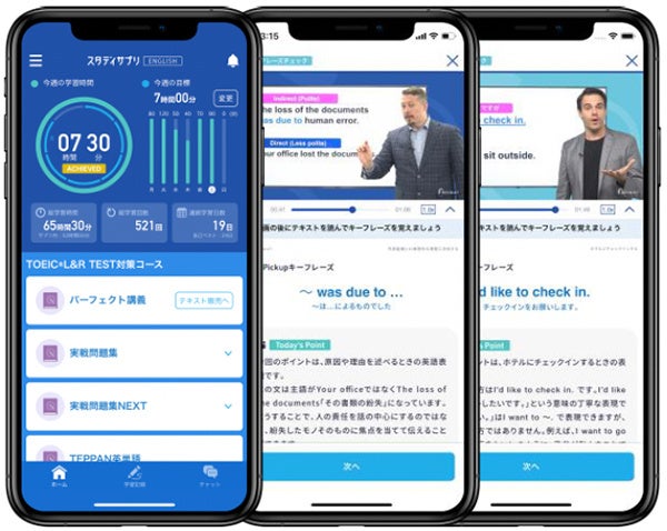1回3分からの隙間時間で英語学習ができるアプリ。大人の英語学習では新日常英会話コース / TOEIC® L&R TEST対策コース / ビジネス英語コースがあり、TOEIC® L&R TEST対策コースでは業界初、オンライン完結型コーチングを実現したパーソナルコーチプランも提供しています。2021年には、新日常英会話コース、ビジネス英語コースにオンライン英会話がセットになったプランも登場。