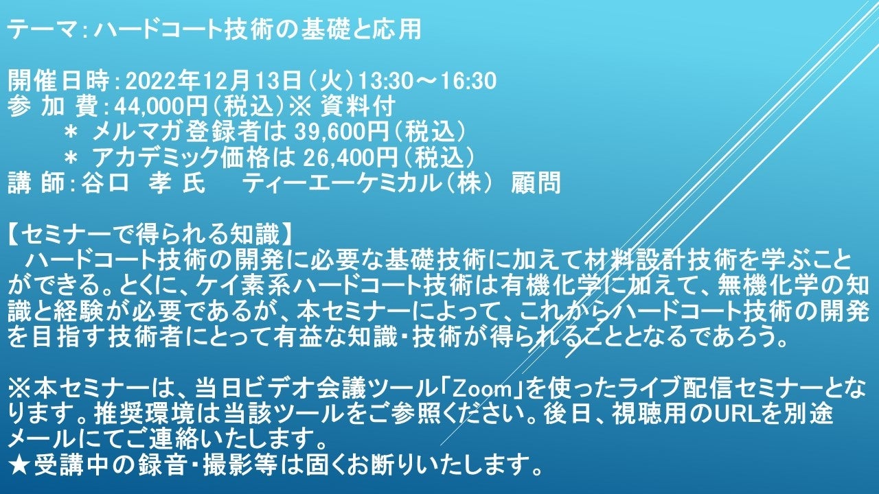 先端技術情報や市場情報を提供している(株)シーエムシー・リサーチ(千代田区神田錦町: https://cmcre.com/ )では、 各種材料・化学品などの市場動向・技術動向のセミナーや書籍発行を行っておりますが、 このたび「ハードコート技術の基礎と応用」と題するセミナーを、 講師に谷口 孝 氏 ティーエーケミカル(株) 顧問)をお迎えし、2022年12月13日(火)13:30より、 ZOOMを利用したライブ配信で開催いたします。 受講料は、 一般:44,000円(税込)、 弊社メルマガ会員:39,600円(税込)、 アカデミック価格は26,400円(税込)となっております(資料付)。