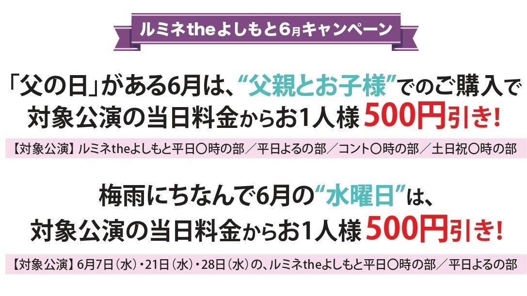 そのほか、メディアで活躍する人気芸人が多数出演するなど豪華出演ラインナップの「ルミネtheよしもと 土日祝〇時の部プレミアム」を新設(不定期開催、なお6月キャンペーンは対象外)。夜公演の寄席「よるのお笑いライブ」が、「よるの部」に名称変更いたします。