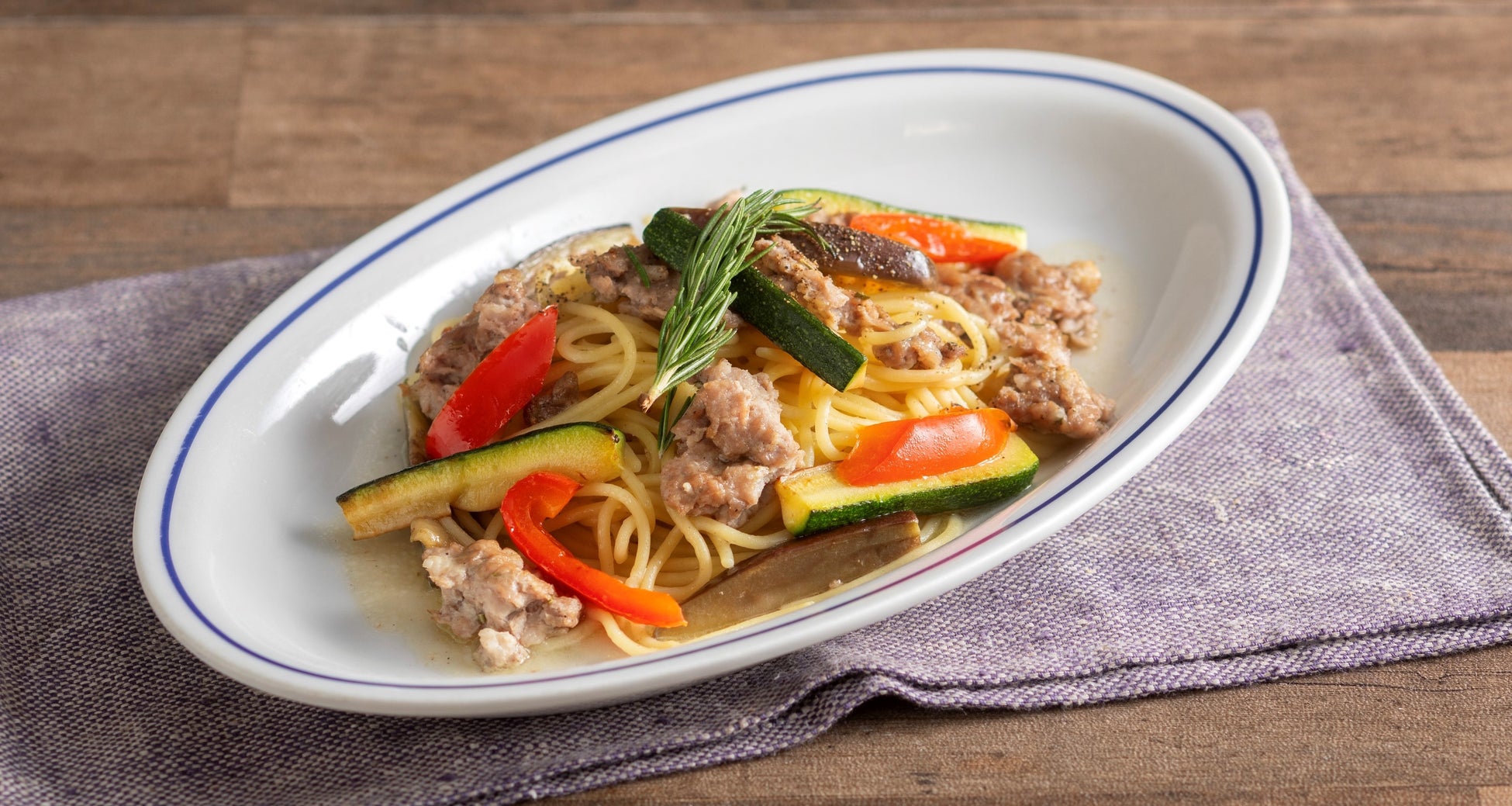 うまみと豊かな風味が特長の神奈川県産ブランドポークを使用したハーブ香るサルシッチャと、茄子、ズッキーニ、パプリカのグリルをオイルソースで仕上げました。