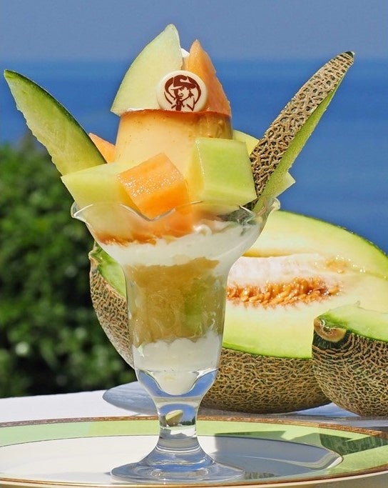 マーロウ一番人気のプリンと爽やかな白ワインゼリー、みずみずしいメロンをたっぷり乗せた夏らしいパフェ。