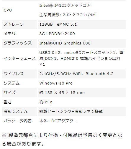 【Windows 10 Pro/J4125・4コア/メモリ8GB/WiFi/BT/HDMI/USB3.0×2/microSD】
