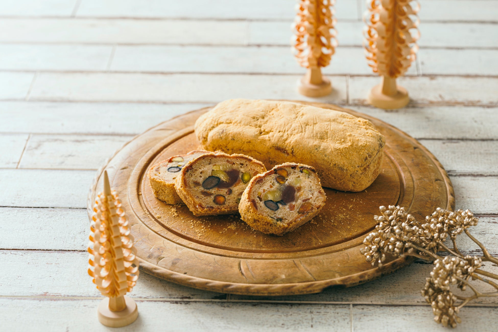 こし餡、栗、黒豆、市田柿、いちじくを使用した和のシュトーレン。アクセントにピスタチオを練り込みました。