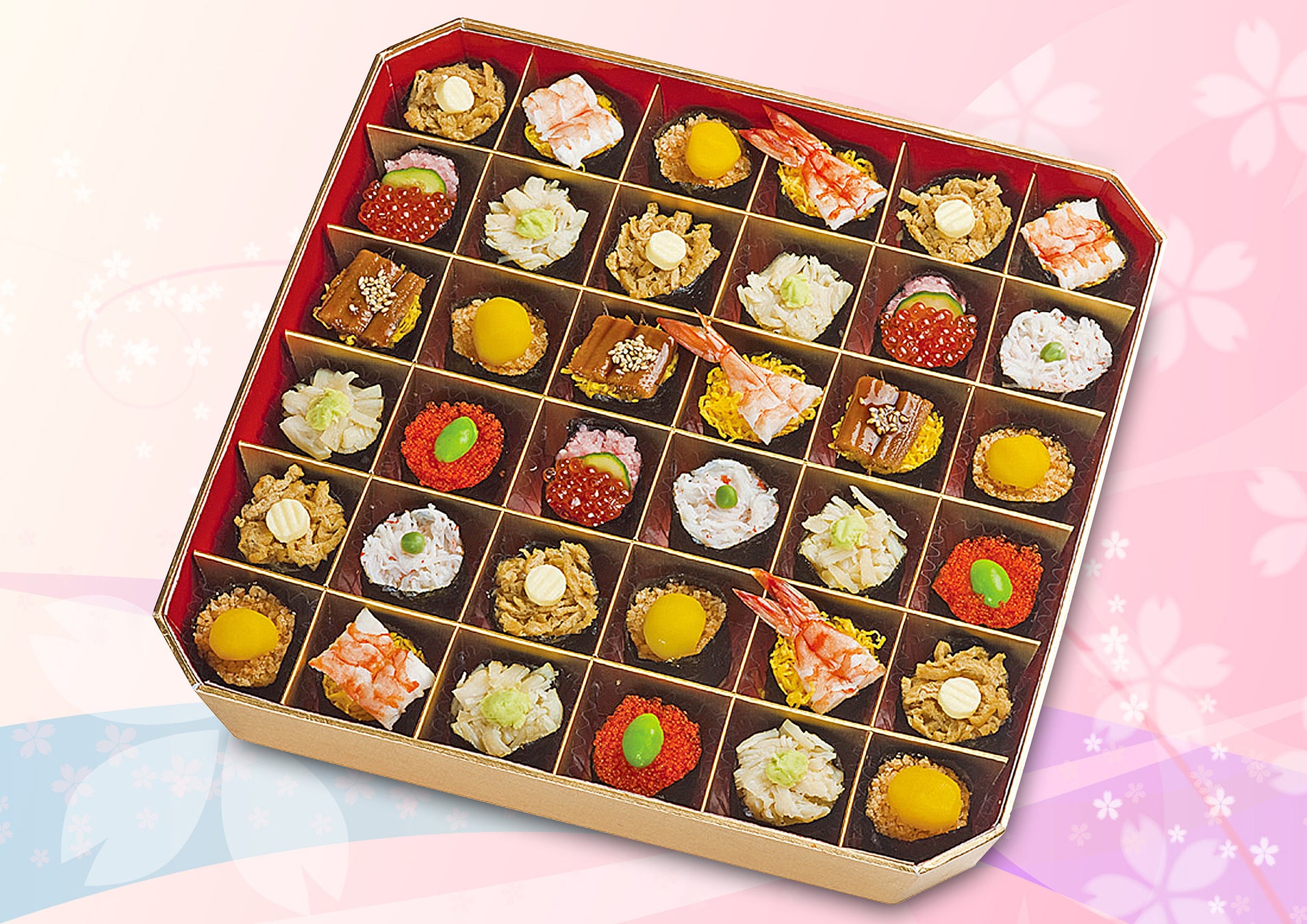 プチケーキをイメージした一口サイズの華やかな細工寿司。海老・帆立・いくら・とびっこ・煮穴子・カニカマ・栗・お揚げにチーズの8種類の味が楽しめます