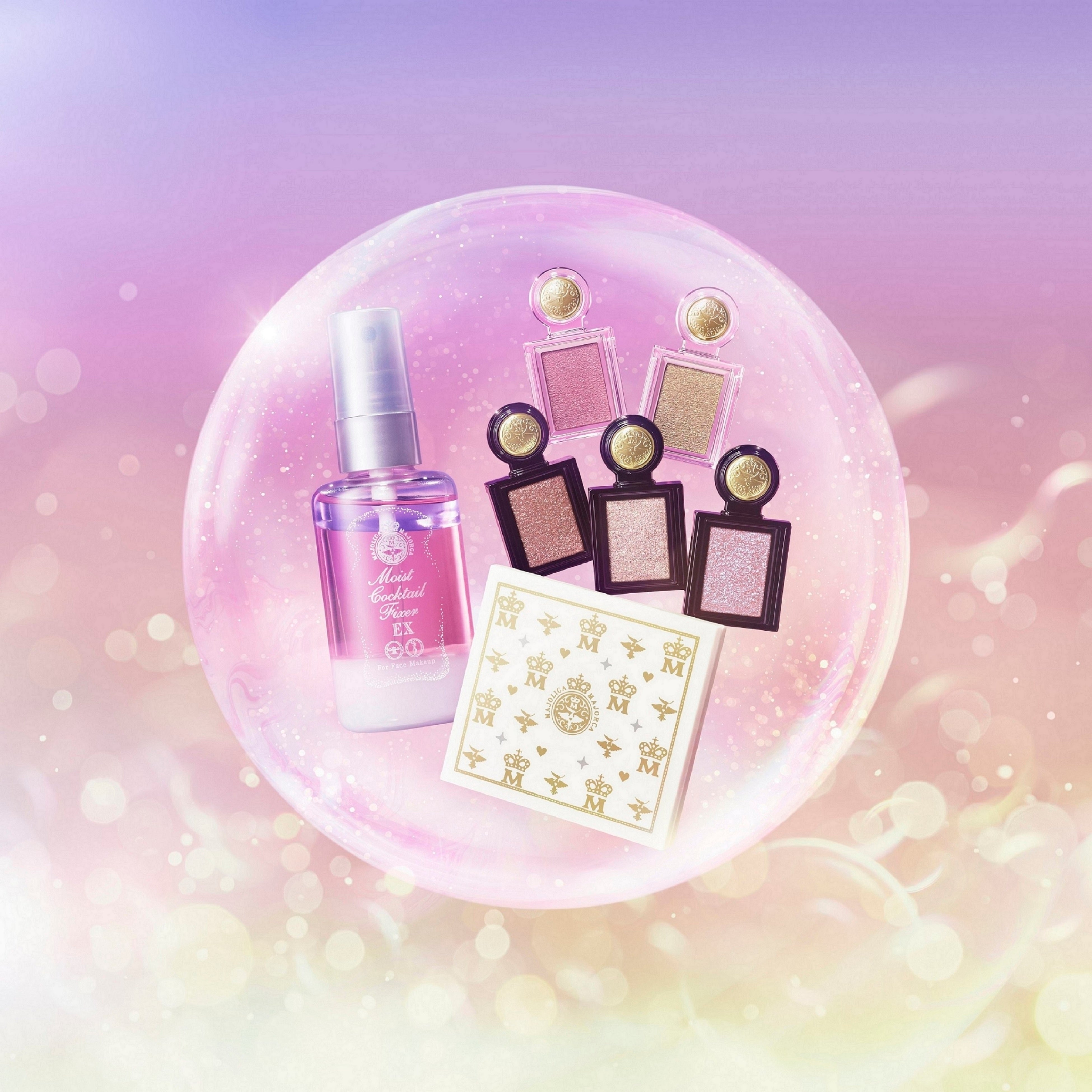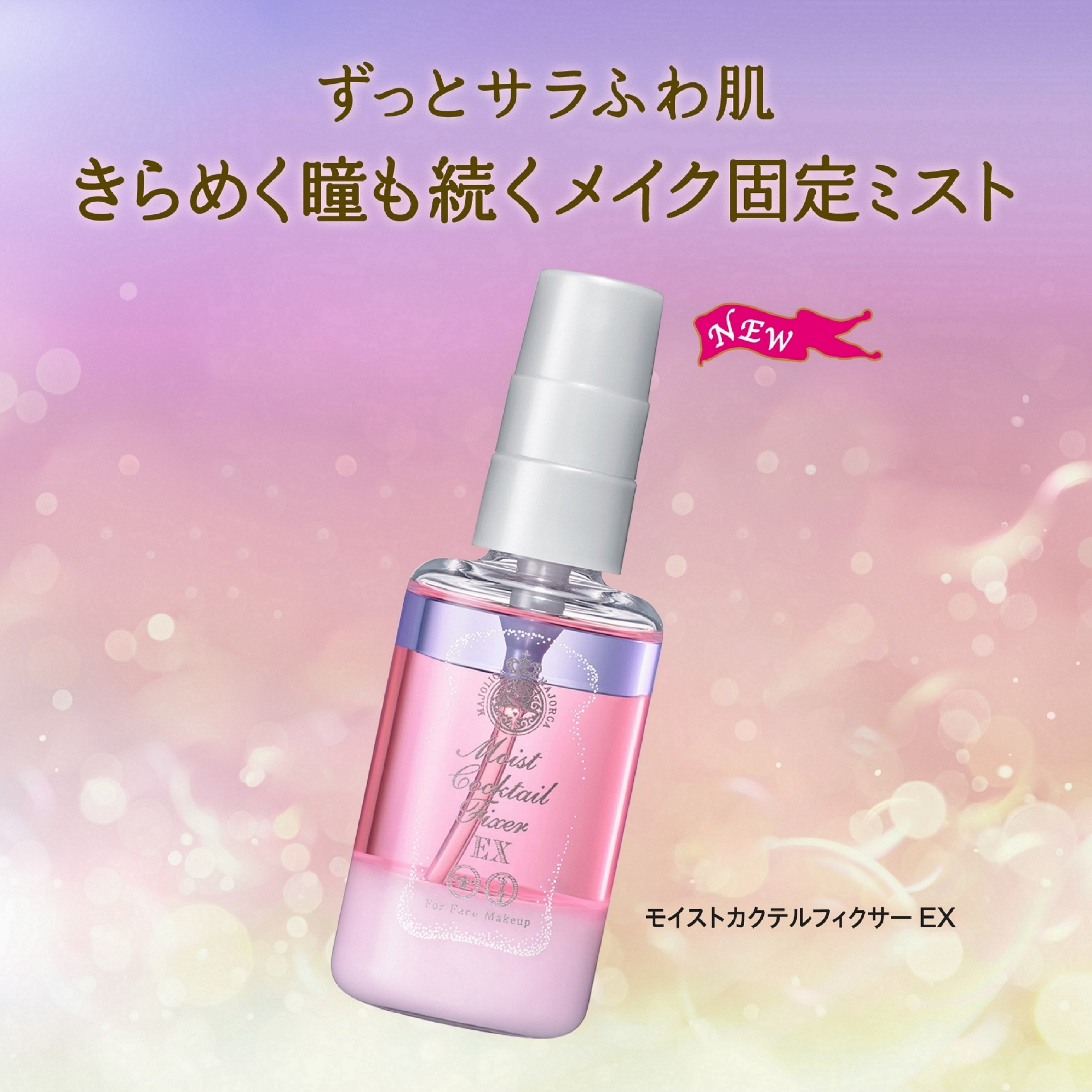 「マジョリカ マジョルカ モイストカクテルフィクサー EX」は、見た目も可愛い化粧水・美容液・おしろいの3層タイプです。アイシャドウのラメ・パールの仕上がりを長時間キープしながら、テカりを防ぎ、毛穴の目立ちにくいサラふわ肌に仕上げます。さらに、花粉やちり・ほこりからも肌を守り、霧のようなふんわりとしたミストが優しく肌を覆います。ベースメイクだけでなく、アイシャドウの仕上がりまでキープするメイク固定ミストです。