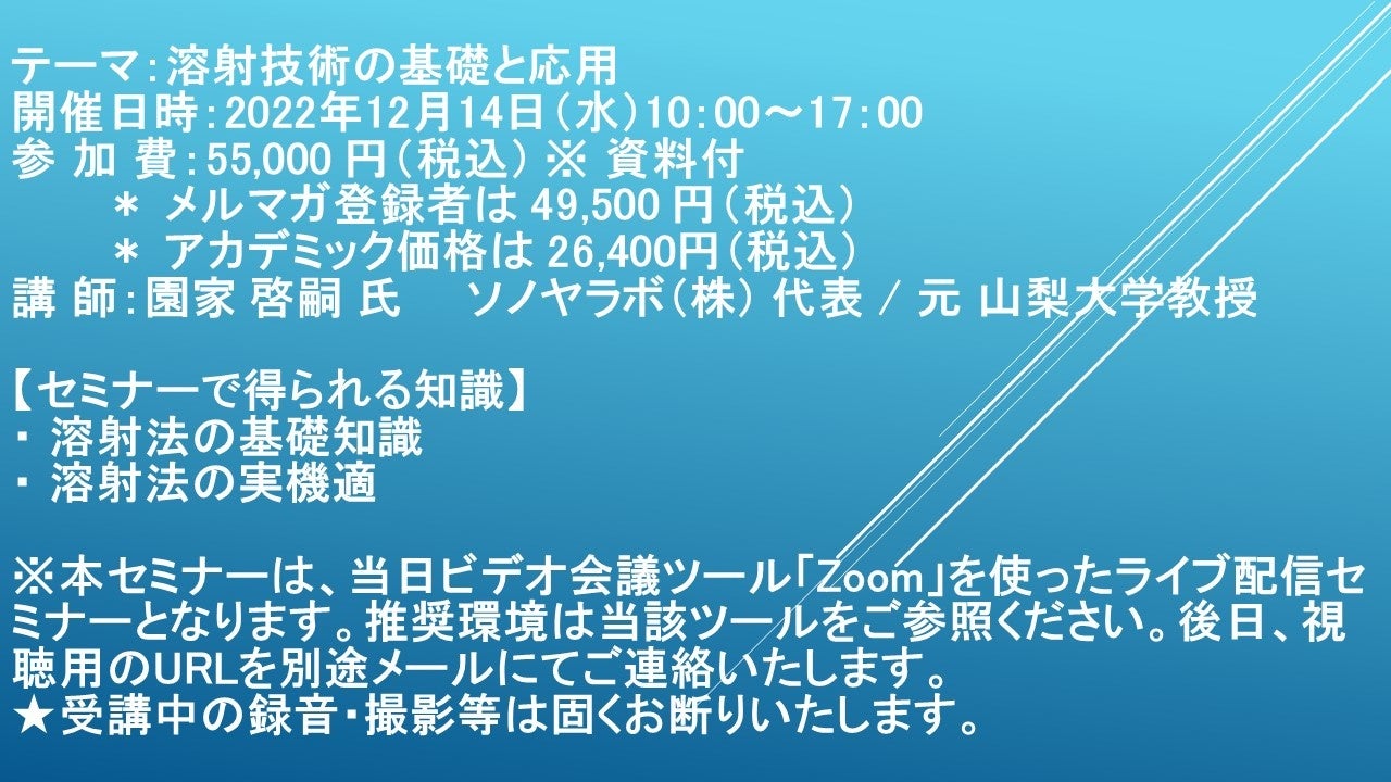 先端技術情報や市場情報を提供している(株)シーエムシー・リサーチ(千代田区神田錦町: https://cmcre.com/ )では、 各種材料・化学品などの市場動向・技術動向のセミナーや書籍発行を行っておりますが、 このたび「溶射技術の基礎と応用」と題するセミナーを、 講師に園家 啓嗣 氏 ソノヤラボ(株) 代表 / 元 山梨大学教授)をお迎えし、2022年12月14日(水)10:00より、 ZOOMを利用したライブ配信で開催いたします。 受講料は、 一般:55,000円(税込)、 弊社メルマガ会員:49,500円(税込)、 アカデミック価格は26,400円(税込)となっております(資料付)。