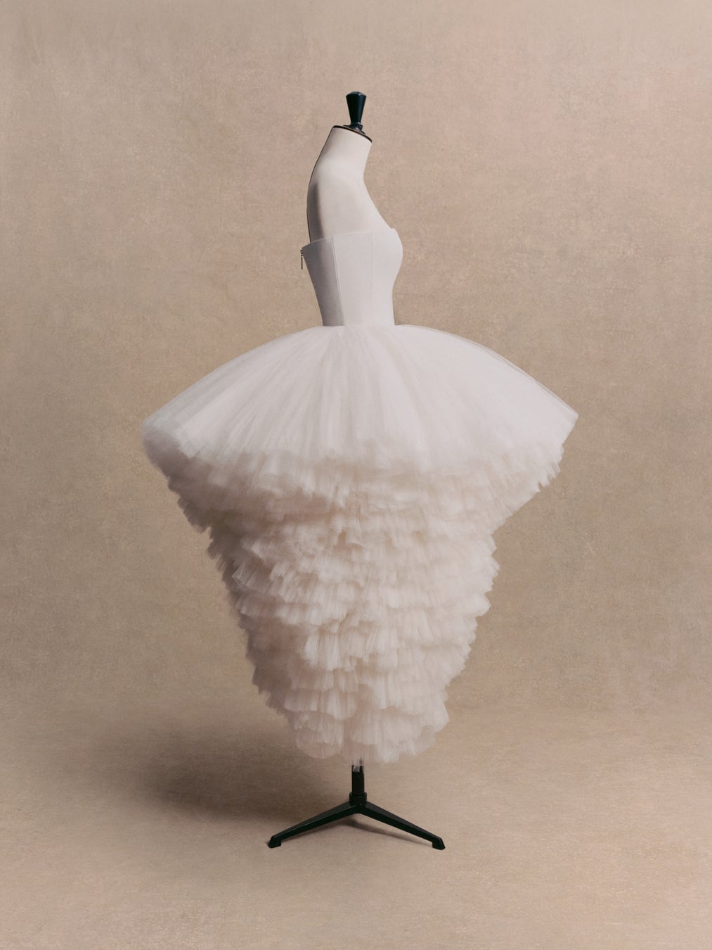 チェイス·インフィニティが着用したドレスは、ホワイトのダブルシルクサテン製ビスチェに、ミルフィーユシルクチュールのスカートを組み合わせたデザインです。エッセンシャルなストレートビスチェに、チュチュから着想を得た非常に豊かなスカートを組み合わせ、ミルフィーユのレイヤーは、不規則と規則的なギャザーが交互に重なり合う構造になっています。各レイヤーの切りっぱなしのエッジはグラデーション状にカットされ、足首に向かって細くなることで、柔らかく軽やかな最終シルエットを生み出しています。