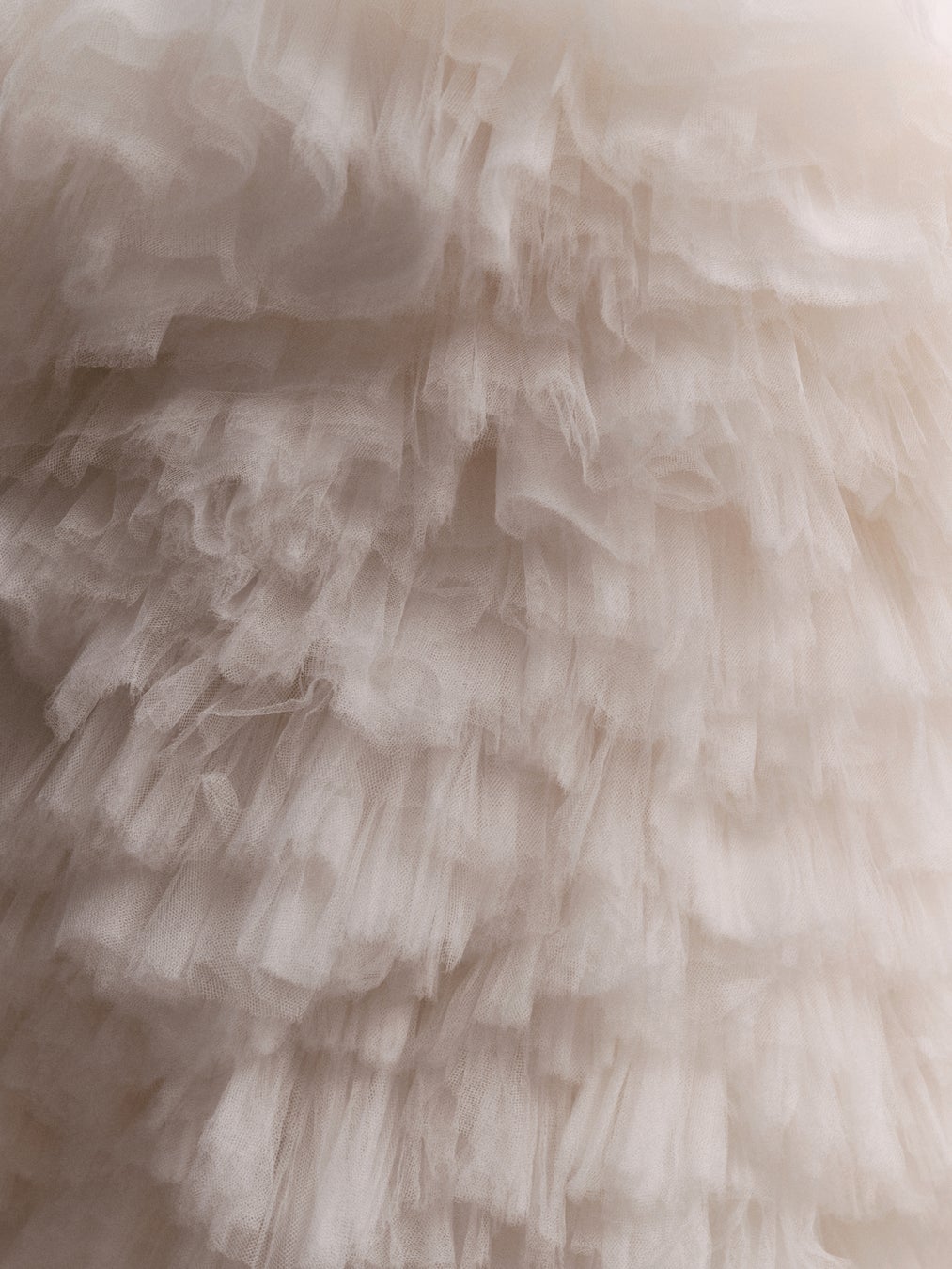 このドレスには200メートル以上のシルクチュールが使用され、制作には約600時間を要しました。