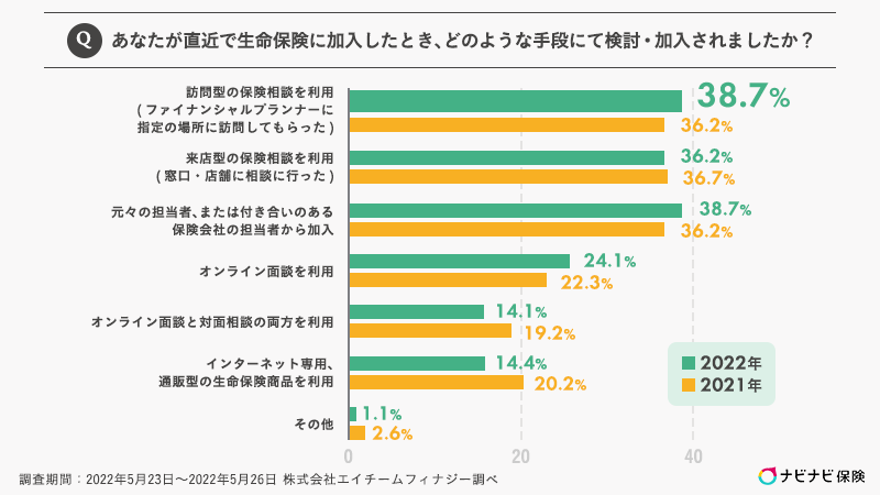 生命保険に加入した際の検討・加入手段について調査してみると、「訪問型の保険相談」と「元々の担当者、または付き合いのある保険会社の担当者から加入」が各38.7%と最多という結果となりました。この2つの回答に関しては、昨年から2.5ポイントUPしており、引き続き多くの方が利用したことが分かりました。