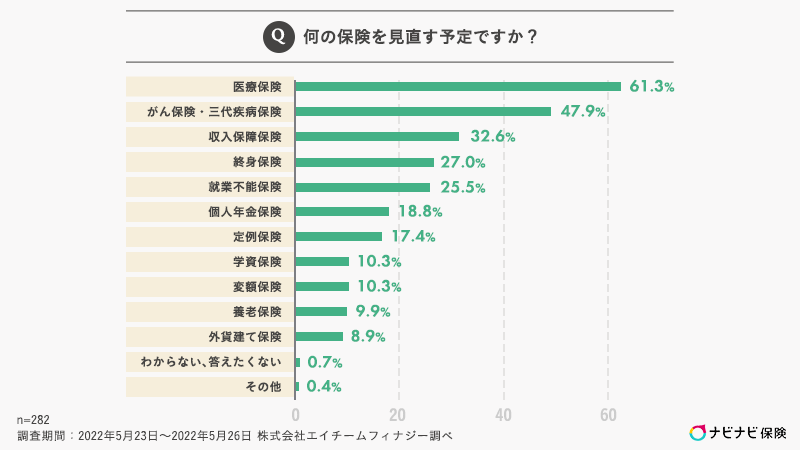 さらに、見直す保険の種類について調査すると、1番多かったのは「医療保険」(61.3%)、次いで「がん保険・三大疾病保険」(47.9%)、さらに「収入保障保険」(32.6%)と続きました。
