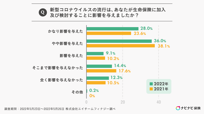 2021年度の調査でも7割以上の人が“新型コロナウイルスが影響を与えた”と感じており、生命保険加入の際、2021年1月以降も引き続き影響が大きいことがわかりました。