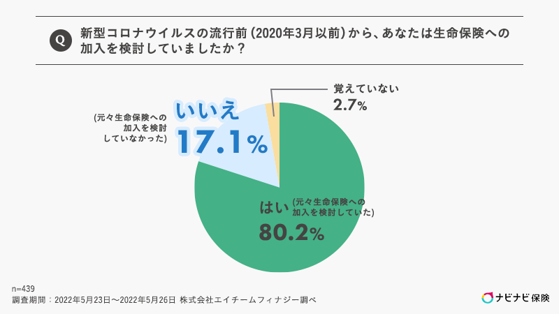 まず始めに、2021年1月以降に生命保険に加入した人に対し、新型コロナウイルス感染症の流行前(2020年3月以前)から生命保険の加入を検討していたかについて調査すると、80.2%が「検討していた」と回答しました。その一方で、17.1%は新型コロナウイルス感染症の流行後に生命保険への加入を検討し始め、加入を決めたようです。