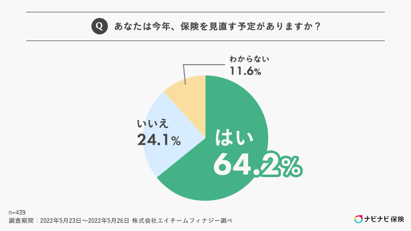 「今年、保険を見直す予定がありますか」という質問に対しては、64.2%が「はい」(見直す予定がある)と回答しました。既に生命保険に加入しているにも関わらず、半数以上が保険を見直す予定のようです。