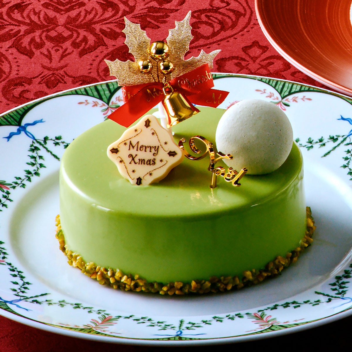 アーモンドが香るピスタチオ生地の上に、ホワイトチョコレートを合わせた濃厚なピスタチオムースを重ねました。中にはピスタチオと相性抜群なイチゴとラズベリーのゼリーとムースを閉じ込めています。断面からのぞく、ベリーの鮮やかな赤とピスタチオの緑が織りなすクリスマスカラーの美しいコントラストもお楽しみいただけます。
