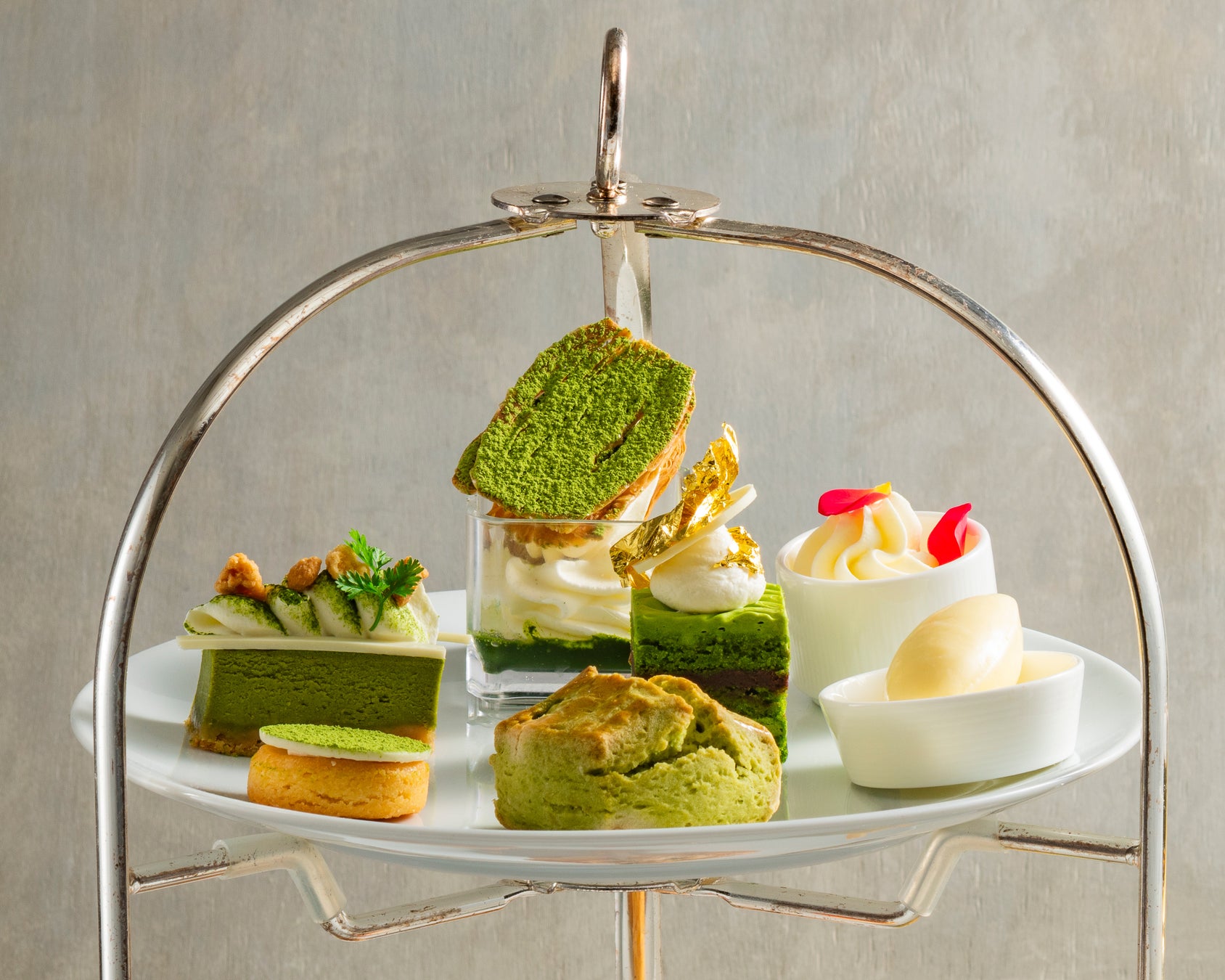 エグゼクティブペストリーシェフ中川 新(なかがわ あらた)とブッフェレストラン「ブリッジ」料理長 橋本直樹(はしもと なおき)プロデュースのもと、季節ごとに変わるスイーツ4種類とスコーン1種&旬の食材をふんだんに取り込んだセイボリー4種類。5月・6月は「抹茶」をテーマにお楽しみいただけます。