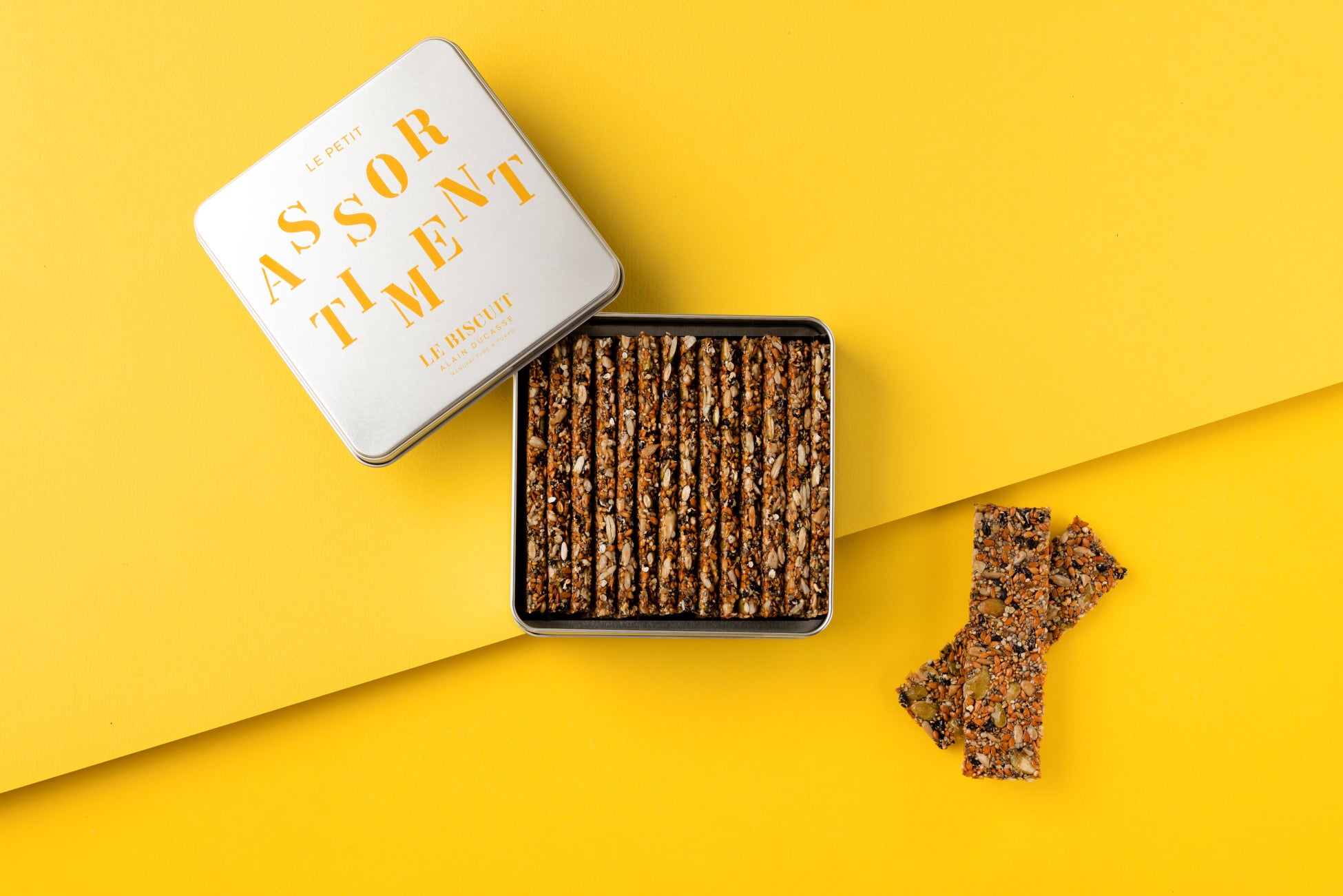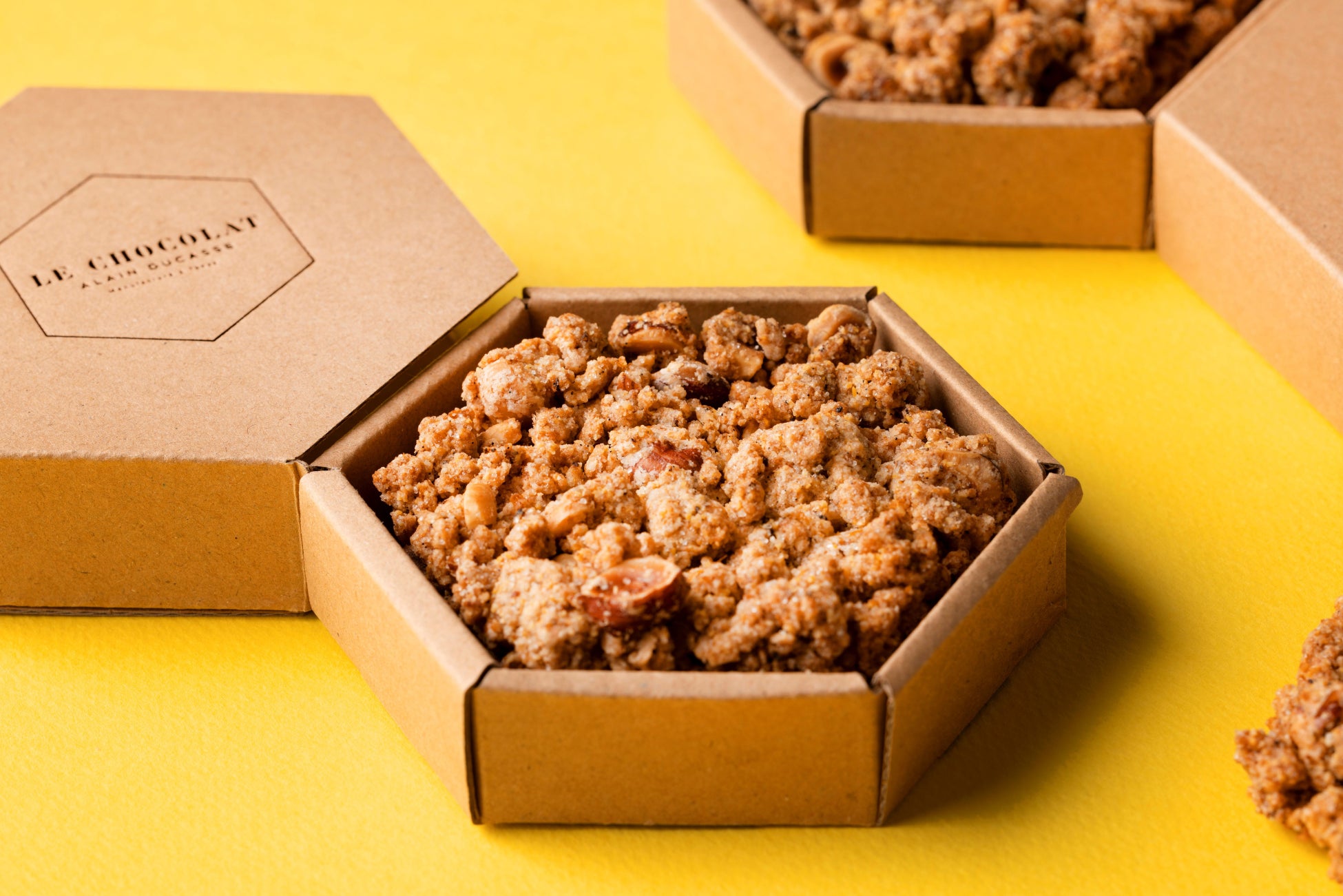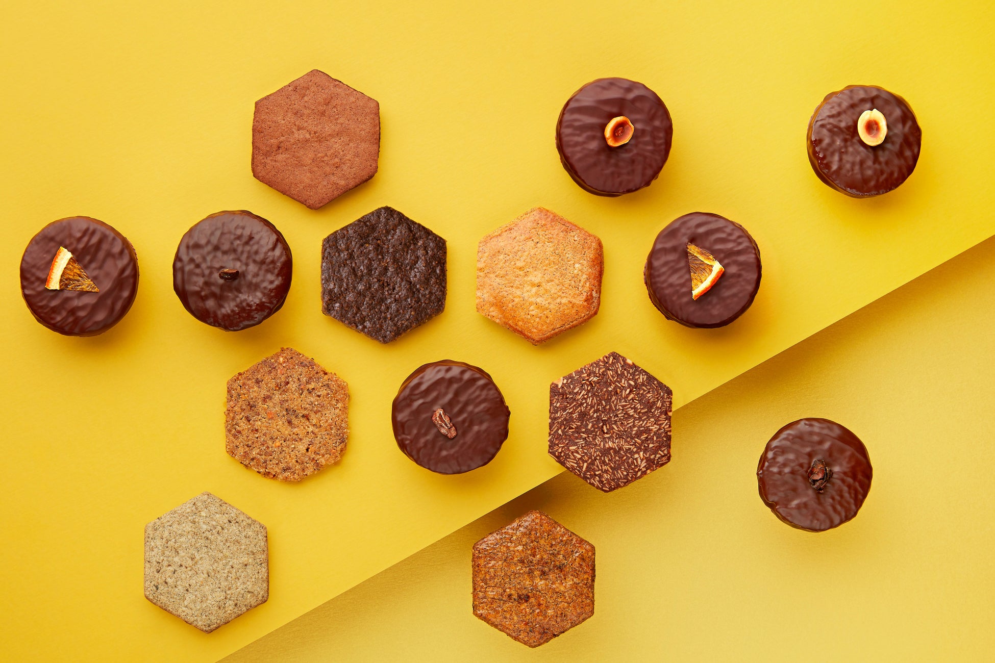 「エグザ」は、アラン・デュカスブランドを象徴する六角形のビスケットです。全7種類のビスケットには、トウモロコシ粉、そばの実、米粉などを使用。それぞれの特徴をいかしながら、さらにナッツや穀物を合わせて、複雑な味わいや豊かな風味を作り出しています。