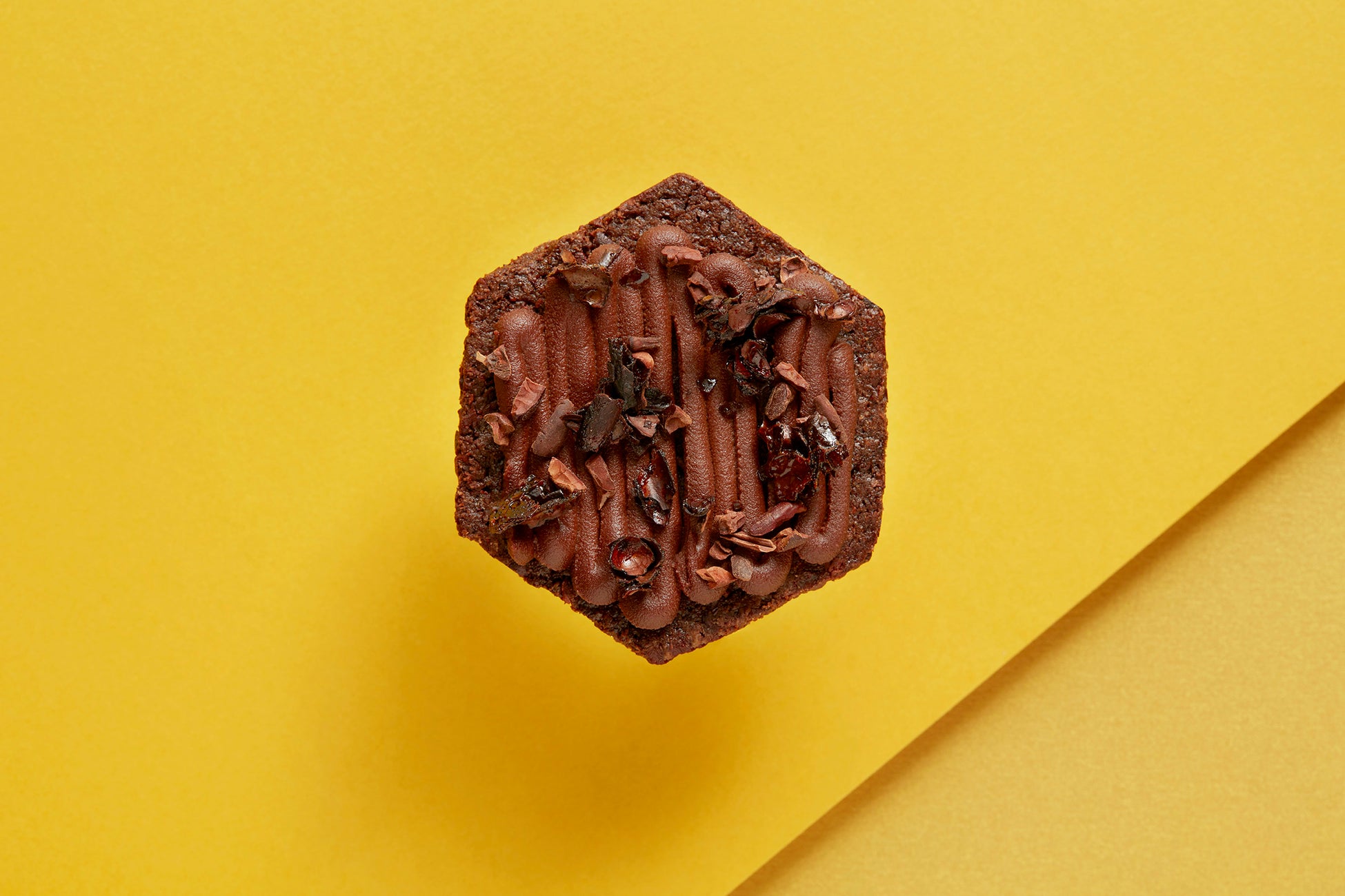 パレは、2枚の薄いビスケットで姉妹ブランド「ル・ショコラ・アラン・デュカス」自家製のガナッシュやプラリネ、マーマレードを挟んで、全体をショコラでコーティングしたスイーツです。ビスケットには、砕いたナッツを練りこんだりオレンジコンフィを混ぜたりと工夫が凝らされており、濃厚で複雑な味わいを楽しめます。