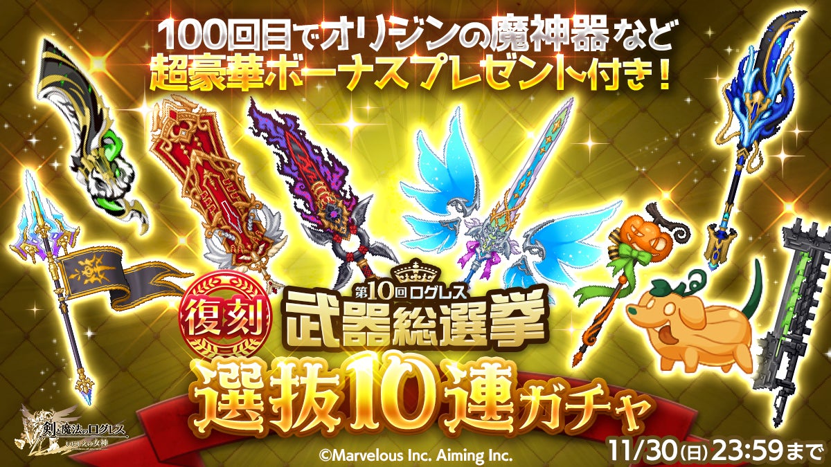 株式会社マーベラス(代表取締役社長:照井 慎一/所在地:東京都品川区)は、スマートフォン向け本格オンラインRPG『剣と魔法のログレス いにしえの女神』において、2025/11/5(水)に「12周年前夜祭-前編-」の開催、2025/11/1(土)に新武器がラインナップした「ジョブ別 斑鳩確率アップガチャ」の販売を含むアップデートを行ったことをお知らせいたします。