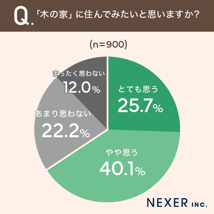 「とても思う」が25.7%、「やや思う」が40.1%で、合わせて65.8%の方が木の家に住んでみたいと回答しました。一方で「あまり思わない」は22.2%、「まったく思わない」は12.0%でした。