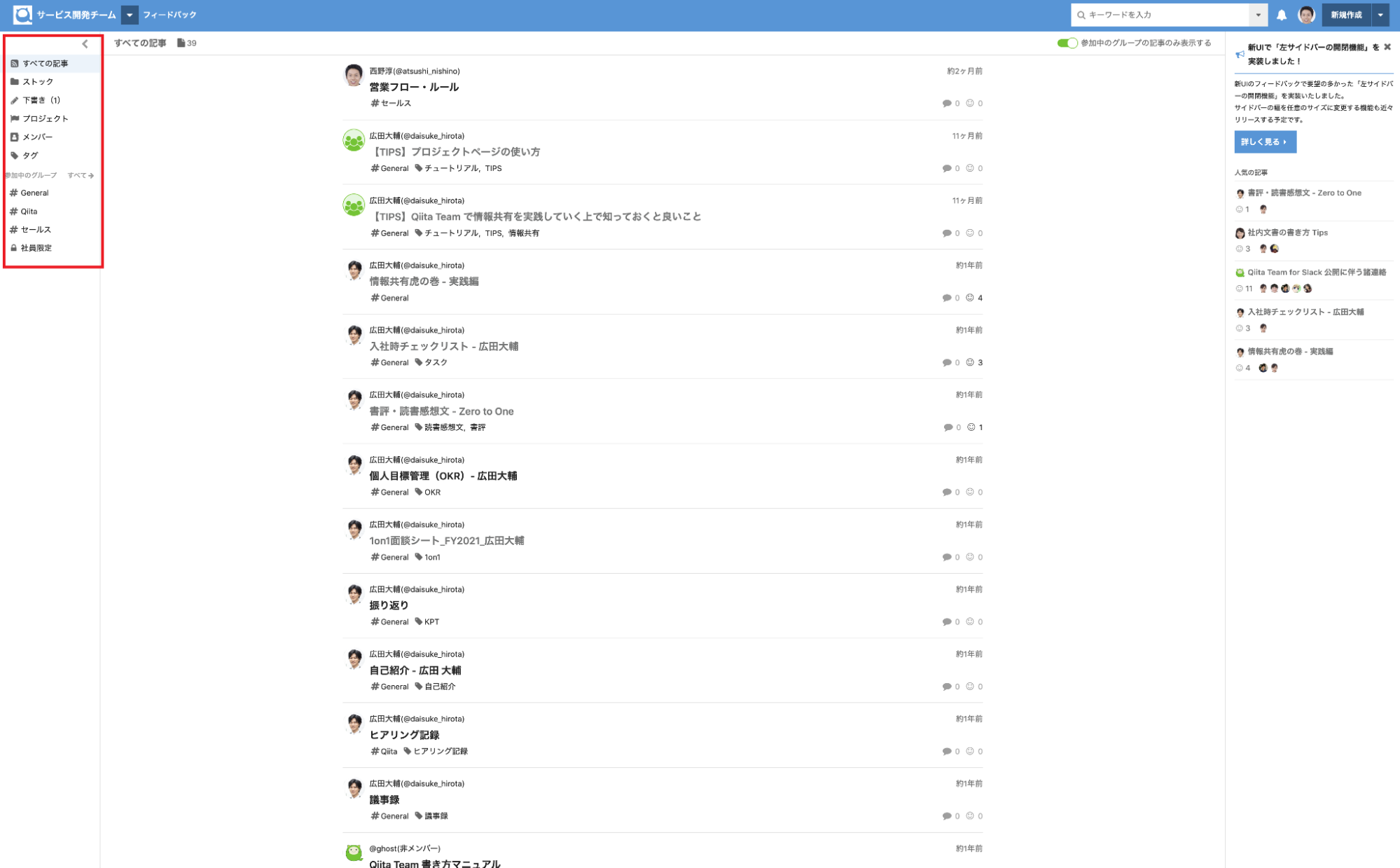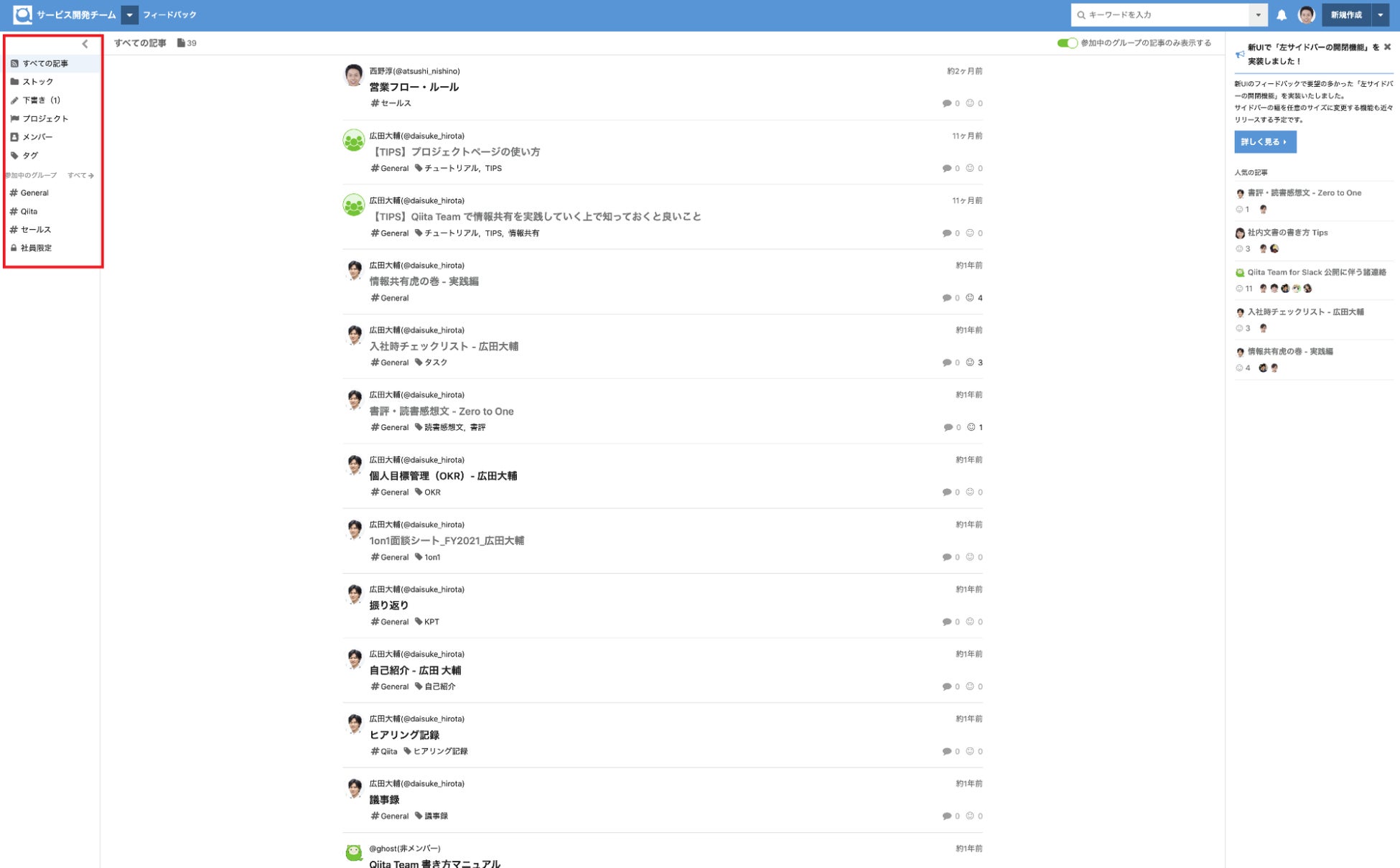 また、「プロジェクト」「ストックした記事」「下書き」「メンバー」「タグ」などのカテゴリも全て左サイドバーに集約して導線をまとめることで、記事の検索や閲覧、投稿をよりシームレスに行うことが可能となります。