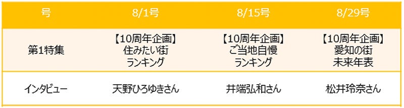 「住みたい街ランキング」(8月1日号)、「ご当地自慢ランキング」(8月15日号)、「愛知の街未来年表」(8月29日号)を特集し、愛知エリアの魅力が伝わる内容となっています。