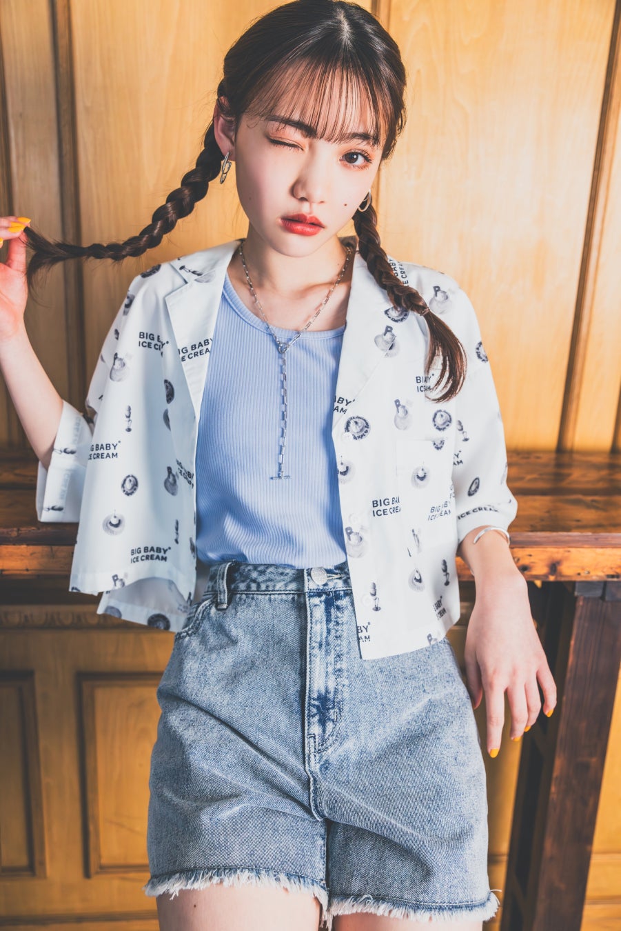 ビッグベイビーアイスクリームのロゴと人気メニューの総柄シャツはモノクロで大人っぽい印象に。羽織としても、ボタンを留めてシャツとしても着回しが可能なアイテム。