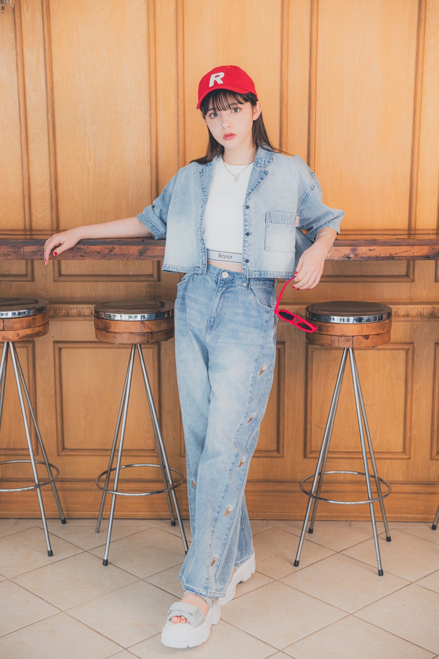 デニム×デニムは今年大注目の着こなし。夏でも涼しく過ごせるようにシャツ、パンツともに接触冷感素材と機能性も抜群。シャツの首元とパンツの両サイドにはアイスの刺繍をほどこして遊び心も満載のアイテムです。