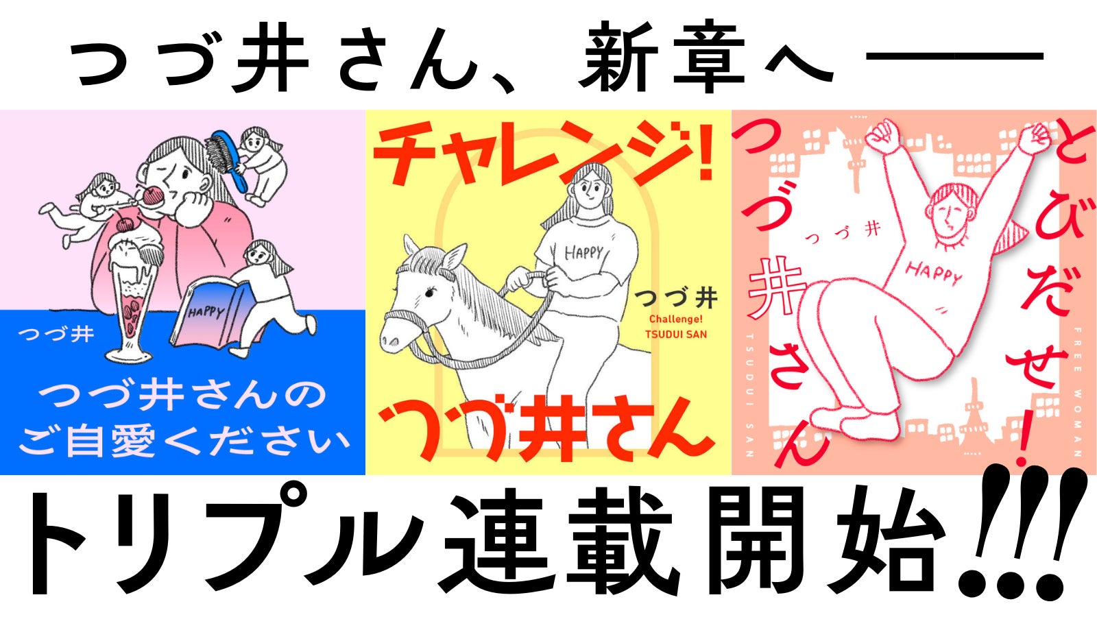 現在も連載中の『とびだせ! つづ井さん』(CREA コミック&エッセイルーム)に加えて、2タイトルの新連載がはじまり、つづ井さんの連載が合計で3タイトルとなりました。