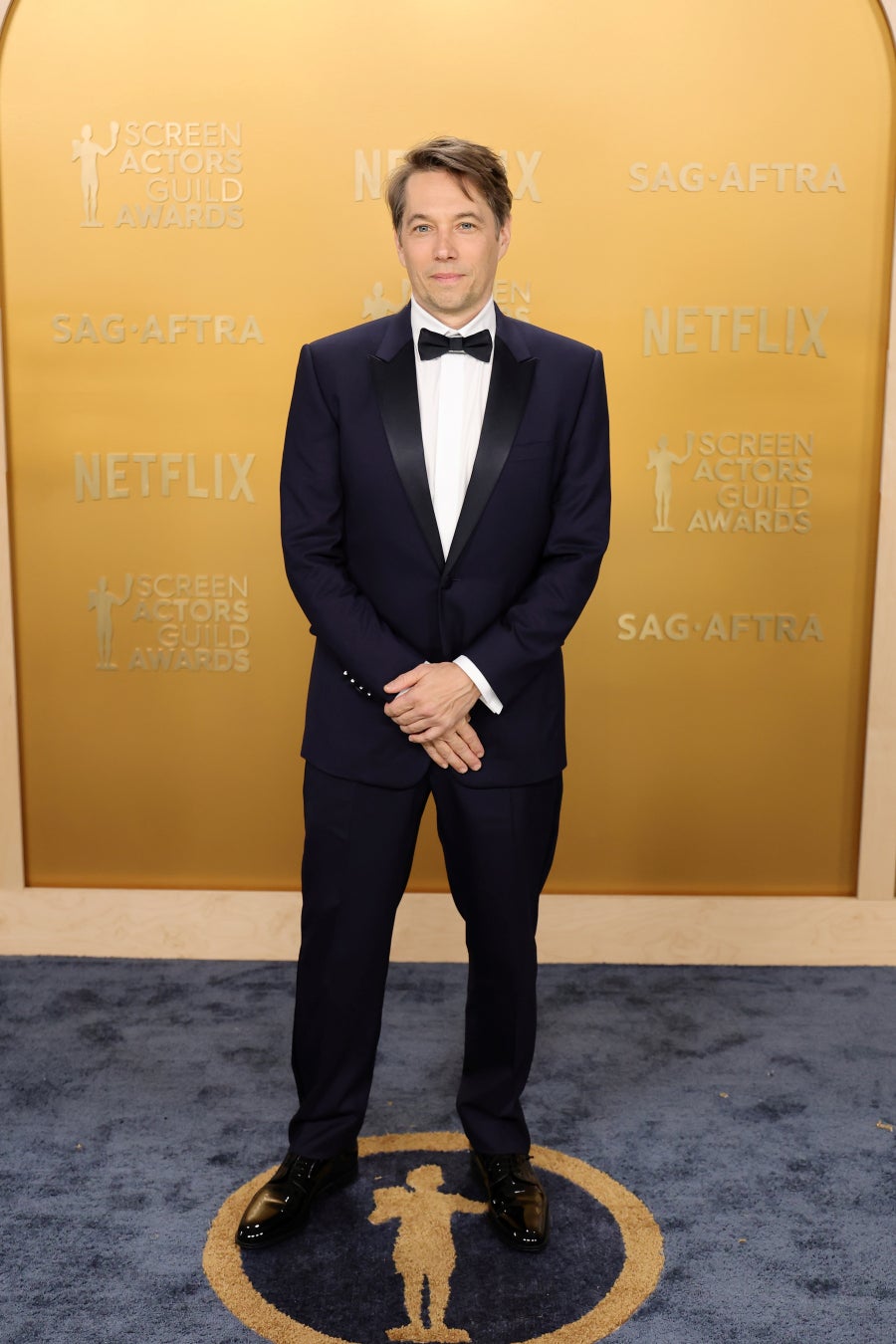 ショーン・ベイカーは、メンズ コレクションからネイビーウールとシルクのピークドラペルタキシードを纏い、ホワイトコットンのウィングチップカラーシャツ、ネイビーのシルクボウタイ、ブラックレザーのダービーシューズを着用しました。