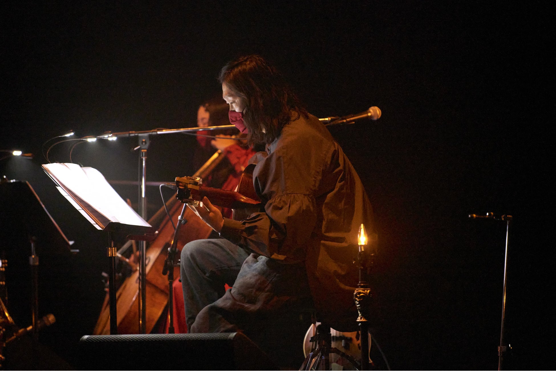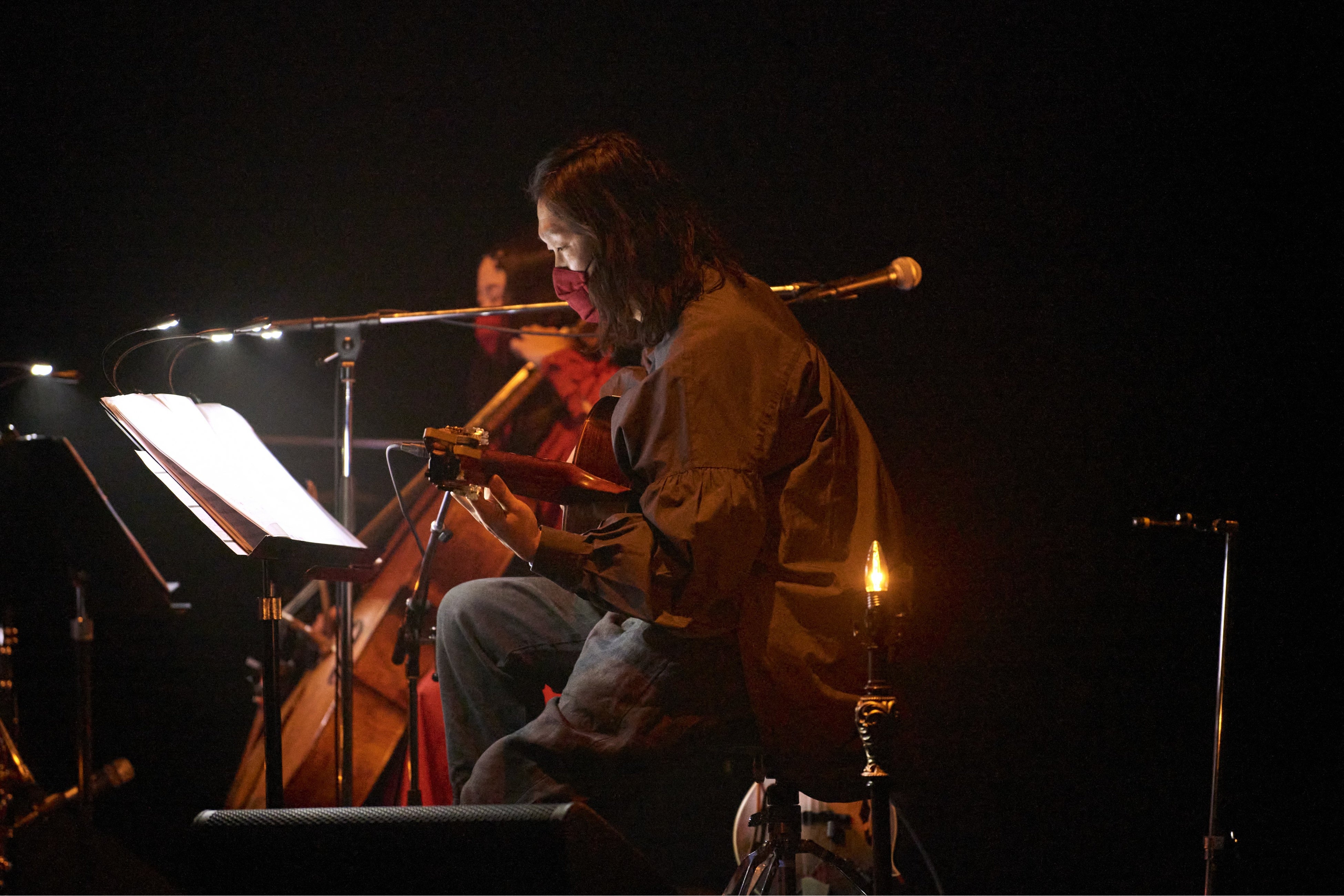 ここでサポートメンバーの羊毛、吉良が加わり、4人での演奏が始まった。まず、この日のセットリストの中でもとりわけファンタジックな1曲「水とシンフォニア」からいきなり引き込まれた。軽やかな歌から、グリーグ「ペール・ギュント」組曲「朝」にオマージュを捧げた間奏への繋ぎにおいて、ギターが生き物のように、チェロが森に吹く風のようになって、楽曲に壮大さを与えていく。「赤い月」では、爪弾かれるギターと、メランコリックなピアノフレーズが夢の世界へ誘ったかと思えば、Kitriのもう1つの側面である“妖しさ”を、吉良のクラリネットが艶やかに引き立てていく。4人編成になったことで、特に間奏における聴き応えがグッと増した印象だが、次の「傘」と「Lily」では、Kitriの魅力が陽だまりのような“歌”であることも再確認できた。“ライブ前のルーティーン”をテーマに話したMCで会場の笑いを誘うと、「時の詩」を丁寧に聴かせて第一部が終了した。