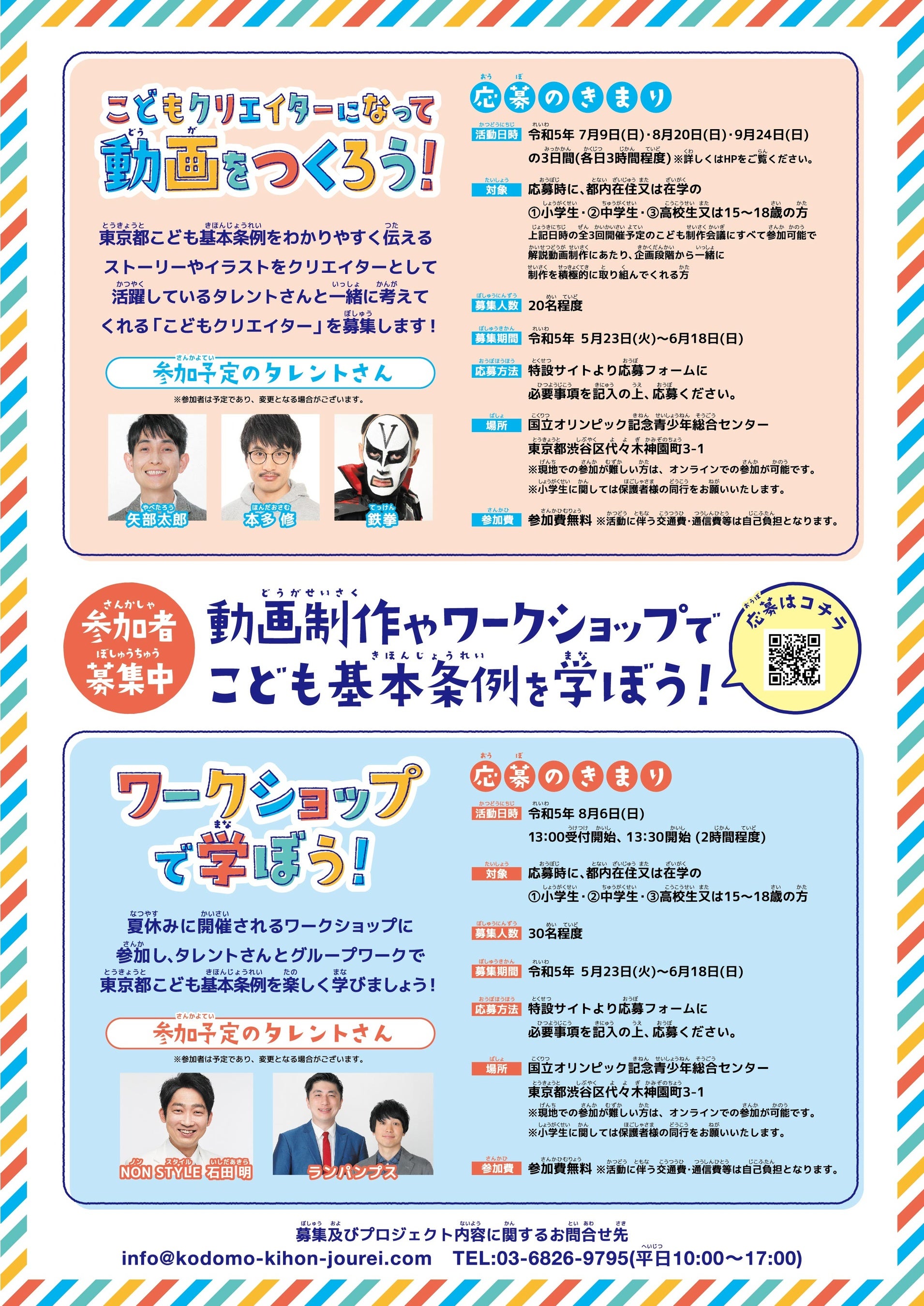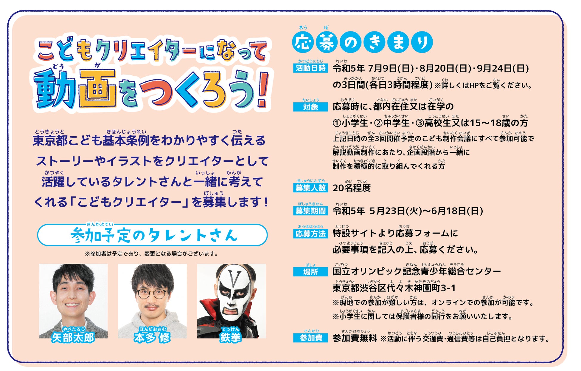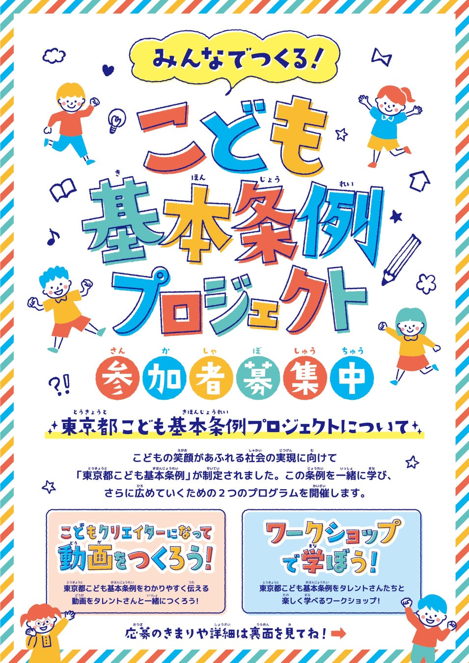 今年度は、年齢や発達段階に応じて、「東京都こども基本条例」の内容をわかりやすく伝えるための動画制作と、「東京都こども基本条例」のことを知ってもらい、こども達自身の発信により、その認知を広げてもらうことを目的としたワークショップを実施します。つきましては、企画段階から一緒に動画の制作に取り組んでいただける 『こどもクリエイター』 とワークショップへの参加者を募集します。