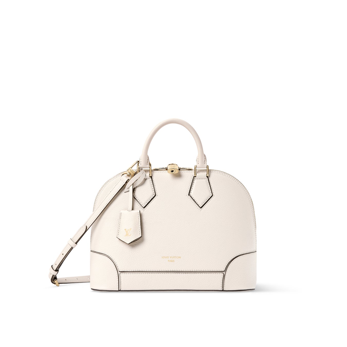 アーティスティック·ディレクター ニコラ·ジェスキエールが、メゾンのトランク製造の伝統から着想を得て誕生した「シルエット」ファミリーの「アルマ·シルエット PM」。アイコニックなバッグ「アルマ PM」を、メタルコーナーの代わりにレザートランクのディテールで再解釈し、トロンプ·ルイユ(騙し絵)効果を演出しました。 アイボリーのレザーに施されたゴールドカラーのパドロック(錠前)とキーベルがアクセントをプラス。斜め掛けや肩掛けはもちろん、手持ちでも楽しめるアイテムです。