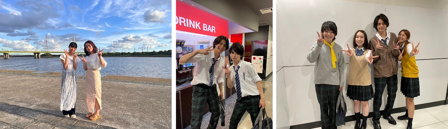 元気よく「おはようございます!」と、笑顔で撮影現場に入った5人。早朝からの撮影だったにもかかわらず、終始、和気あいあいとした雰囲気のもと撮影が行われました。撮影の際に使用された小道具(ガラケーや当時を再現したスクールバックなど)を見た伊藤さんが「うわ、、、懐かしい、、、使ってたわ」と学生時代の記憶を思い出す場面も。また、本ドラマの主題歌のORANGE RANGE「花」がずっと耳に残っていたのか、移動時間や休憩中にリズムを口ずさんでしまう倉本さんに対して赤羽さんが「また歌ってんじゃん!」とツッコミを入れるなど、出演者の仲の良さが垣間見える撮影現場となりました。