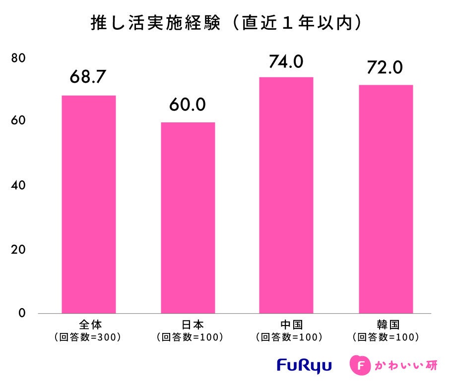 ・推し活実施経験は中国が74.0%と最も高く、次いで韓国の72.0%、日本は60.0%