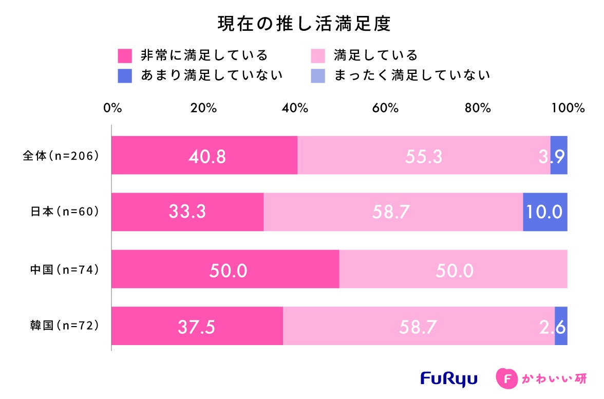 直近1年の推し活経験について調査したところ、中国が74.0%ともっとも多く、次いで韓国72.0%、日本60.0%でした。また推し活経験者の満足度は、中国が100%、韓国が97.2%、日本が90.0%の順で、「非常に満足している」割合も中国がもっとも高い結果となりました。