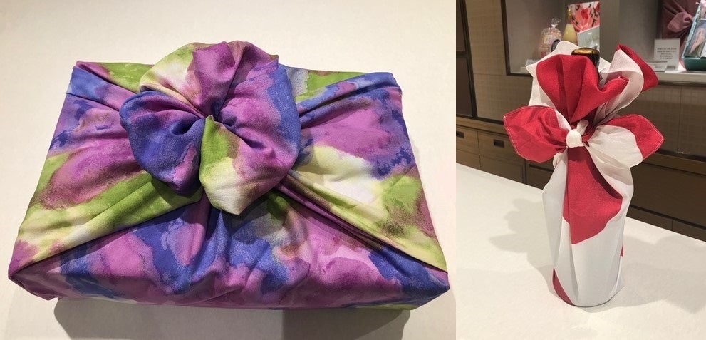 風呂敷もバリエーション豊富に10種類以上(価格帯2,200円~5,500円)取り揃えております。箱を包むだけでなく、瓶などもきれいに包むことができ、記念に残るものなので風呂敷でラッピングするギフトも好評いただいております。