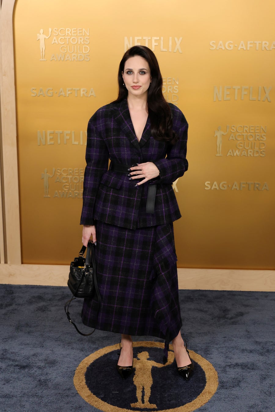 ハリエット・ケインズは、2025年クルーズ コレクションからパープルのタータンチェック柄のウールジャケットとスカートを纏い、ベルト、シューズ、バッグを合わせ登場しました。