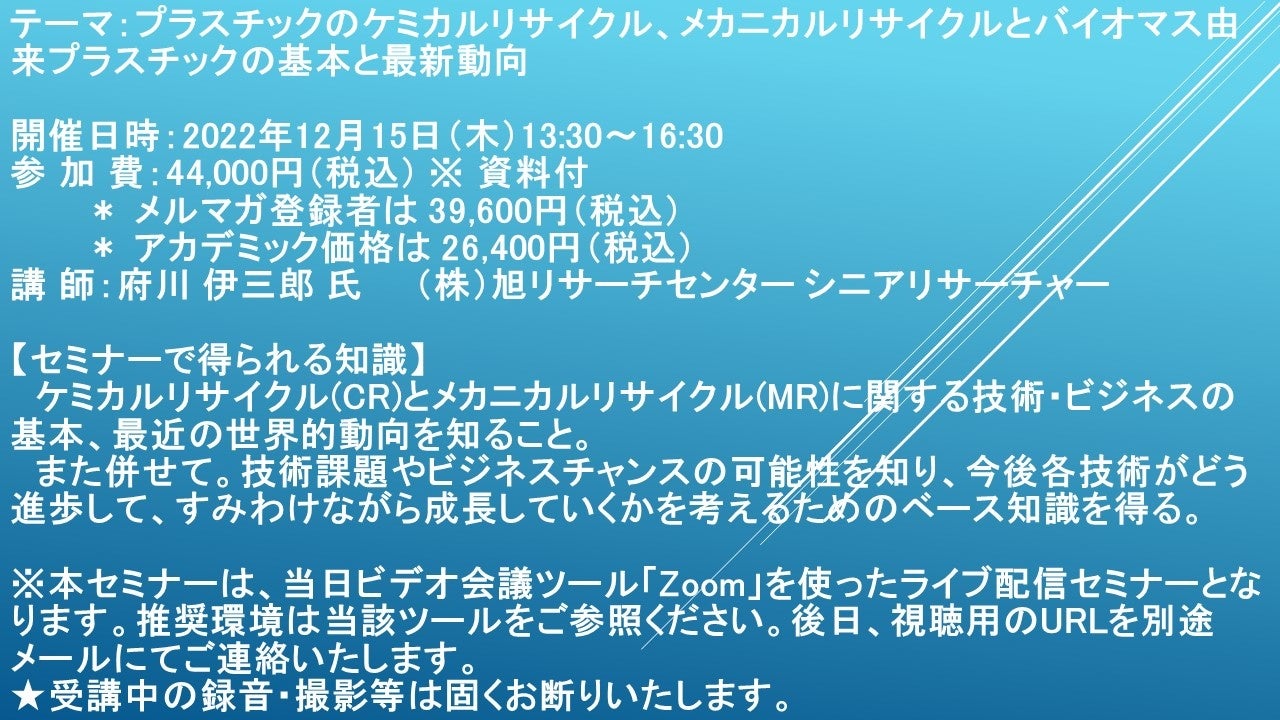 先端技術情報や市場情報を提供している(株)シーエムシー・リサーチ(千代田区神田錦町: https://cmcre.com/ )では、 各種材料・化学品などの市場動向・技術動向のセミナーや書籍発行を行っておりますが、 このたび「プラスチックのケミカルリサイクル、メカニカルリサイクルとバイオマス由来プラスチックの基本と最新動向」と題するセミナーを、 講師に府川 伊三郎 氏 ㈱旭リサーチセンター シニアリサーチャー)をお迎えし、2022年12月15日(木)13:30より、 ZOOMを利用したライブ配信で開催いたします。 受講料は、 一般:44,000円(税込)、 弊社メルマガ会員:39,600円(税込)、 アカデミック価格は26,400円(税込)となっております(資料付)。