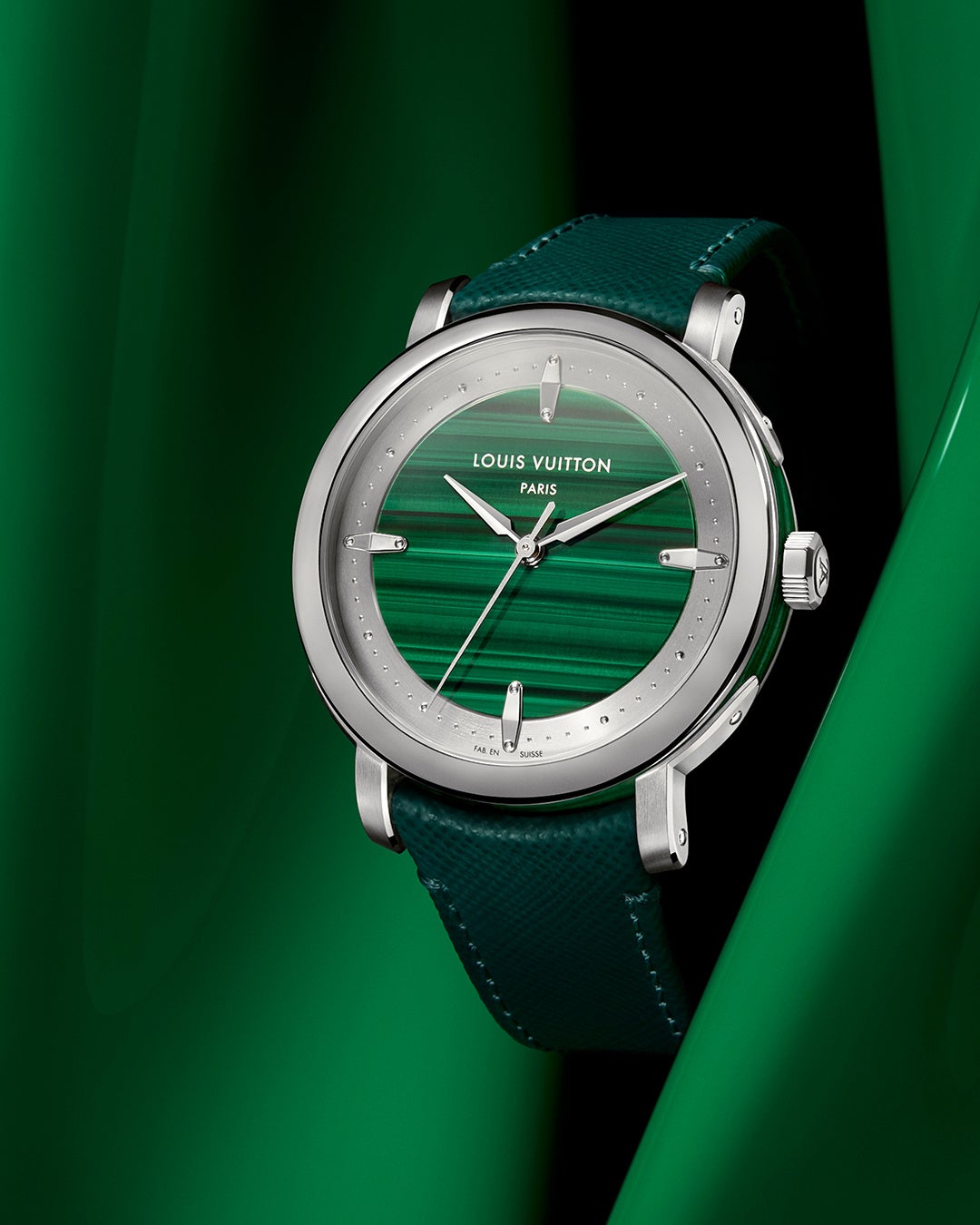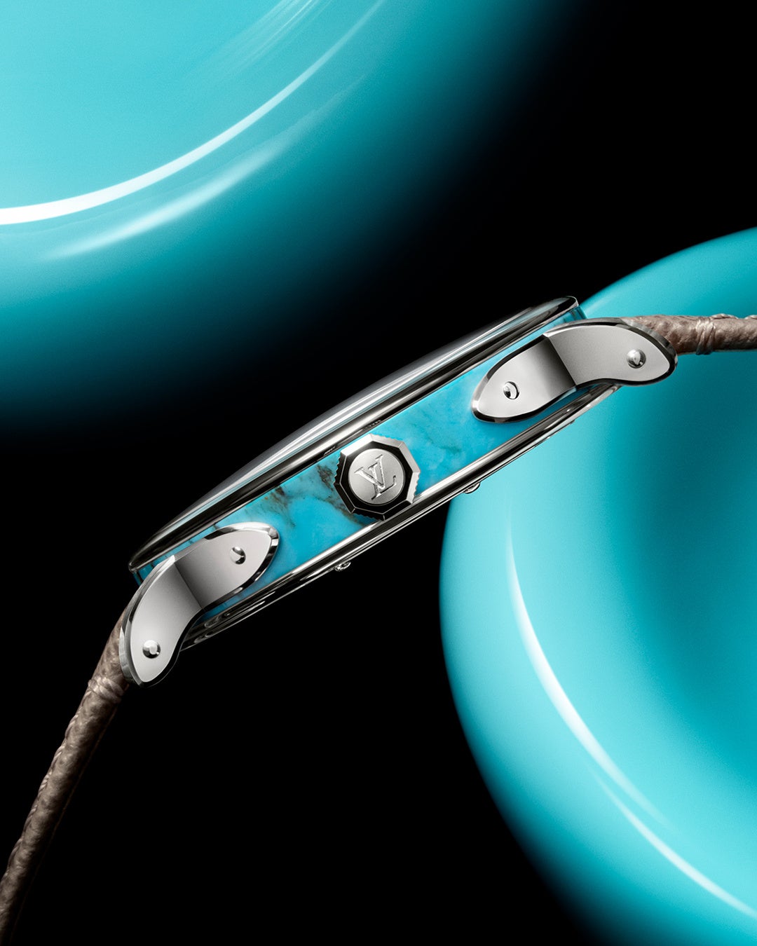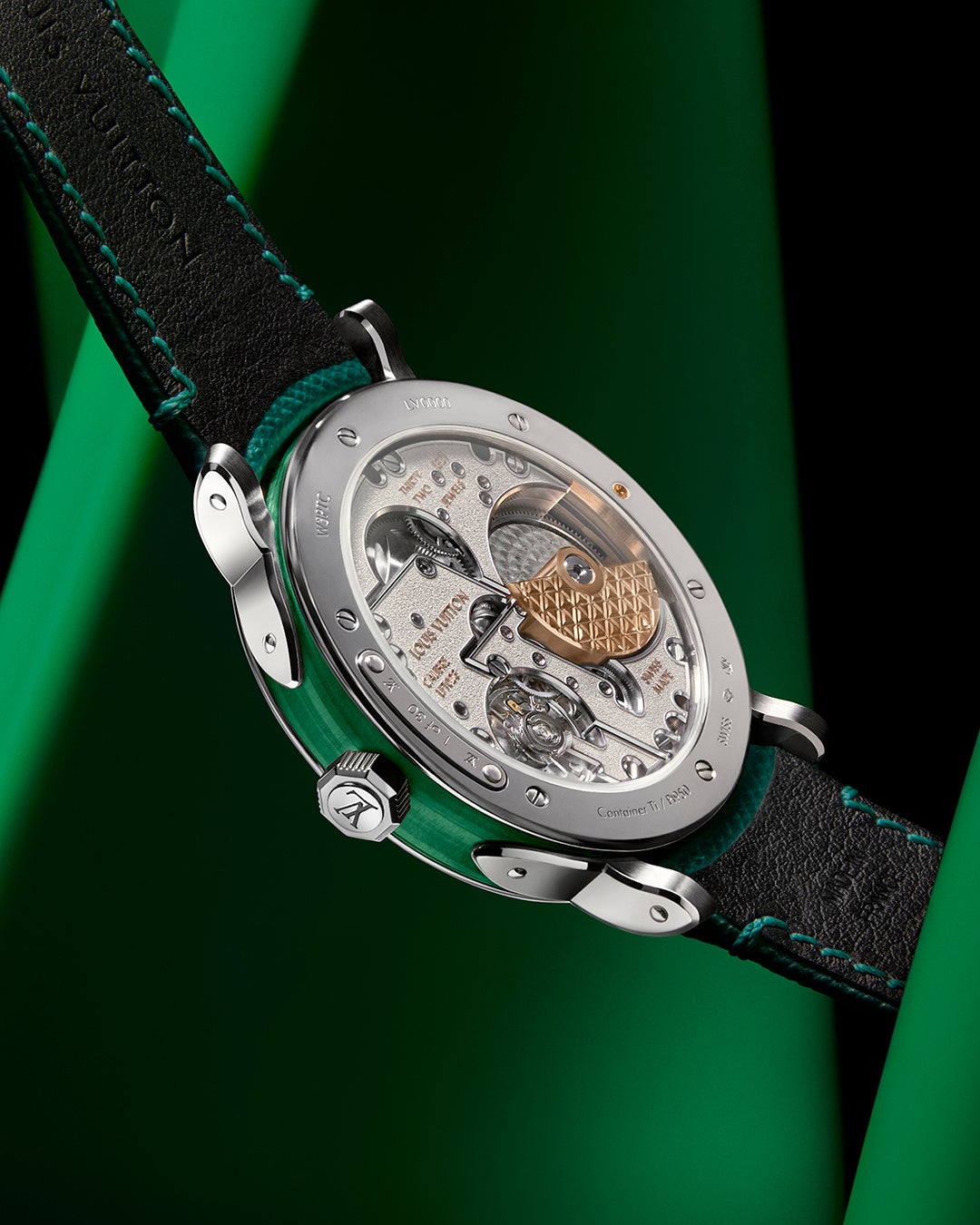 このテーマをさらに深めているのが、これら2つのモデルのための新しいタイプのレザーの組み合わせ。高級感ある豊かな質感の仕上げと控えめな光沢が特徴のサフィアーノレザーストラップが、初めて「エスカル」に採用されました。ターコイズのダイアルとケースを備えたモデルでは、温かみのあるアロヨグレーのサフィアーノレザーストラップを組み合わせて、石の色調を引き立たせています。マラカイトモデルの緑の色合いは、レインフォレストグリーンのサフィアーノレザーストラップで補強され、この色合いの奥深さを堪能できます。どちらのストラップも同系色のハンドステッチが施され、控えめで洗練された印象を醸し出しています。