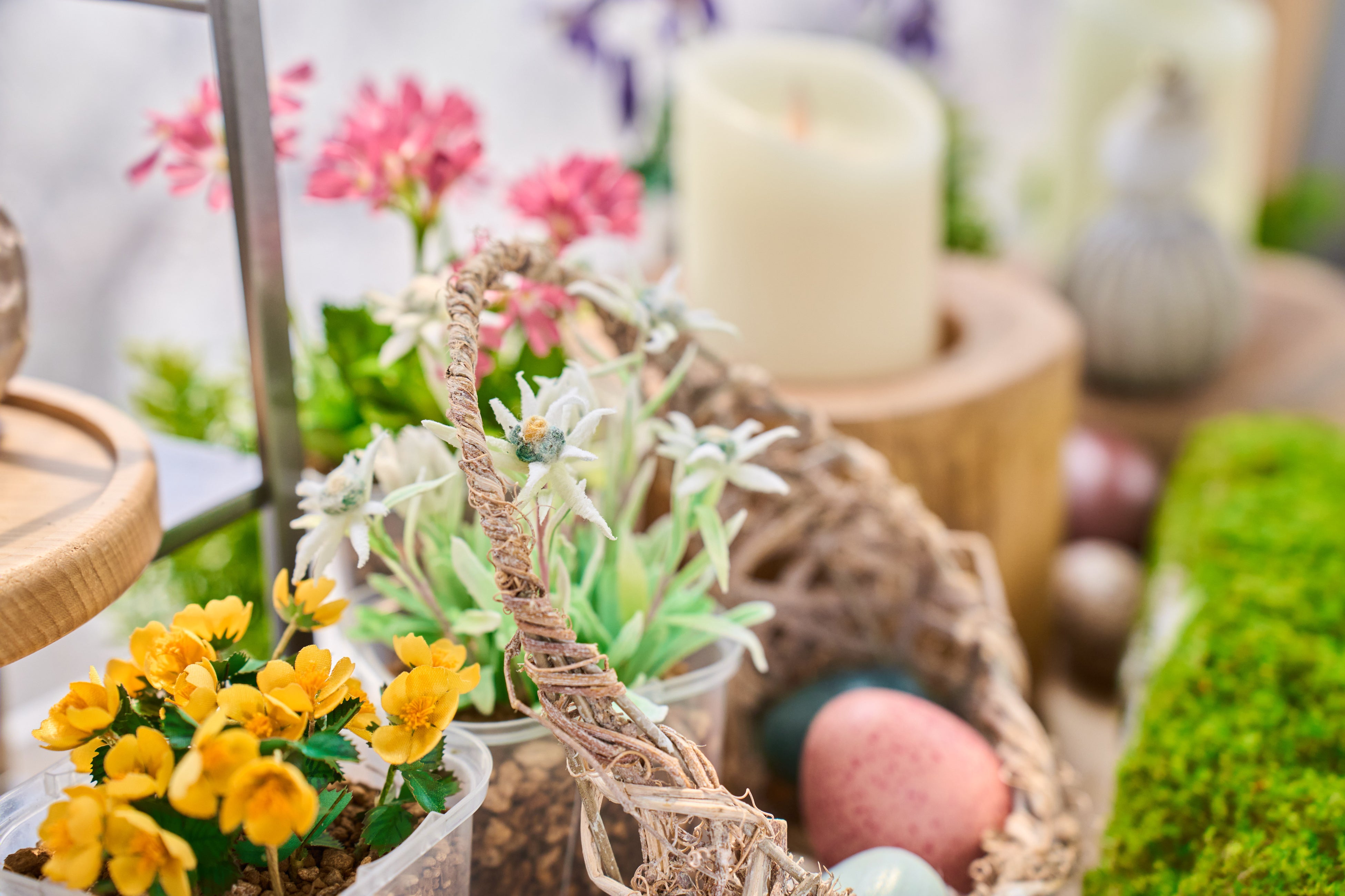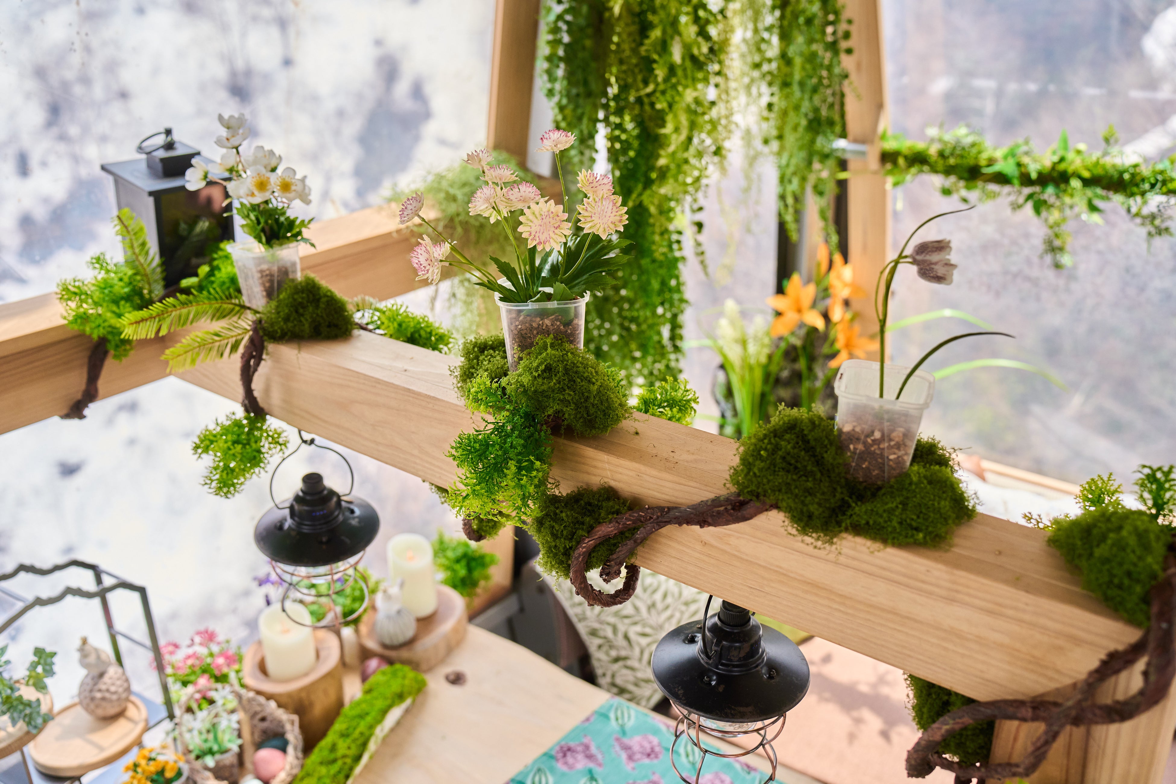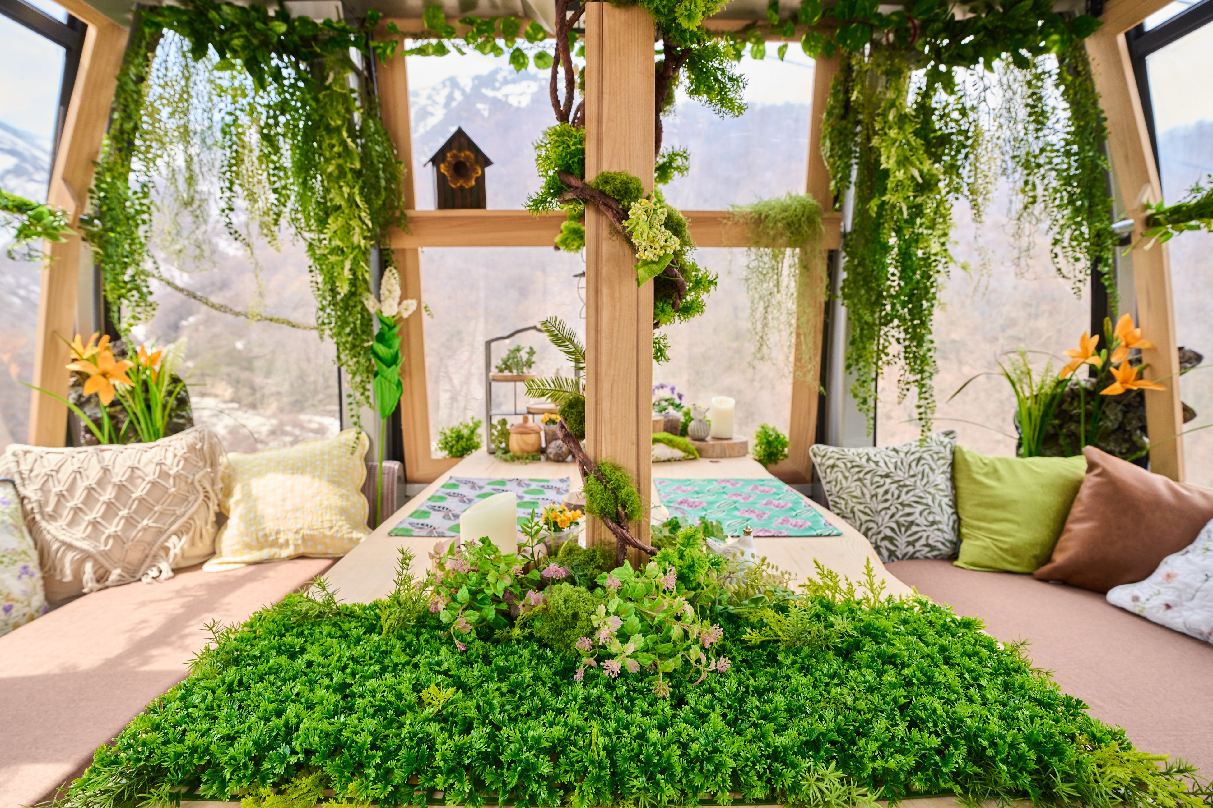 谷川岳ヨッホの22人乗りゴンドラは国内でも3台のみで、他のゴンドラと比べてゆったりとくつろげるのが特徴です。ゴンドラの一部が、期間限定で特別な「ボタニカルゴンドラ」に変身します。車内はアーティフィシャルフラワー作家・GEOCOLORによる精巧な高山植物を模した作品を展示します。開花時期や場所が異なる高山植物を、ボタニカルゴンドラでは一度に眺めることができるのも醍醐味です。さらに、カーテンやクッション、ランチョンマットに至るまで植物をモチーフとした装飾を施しました。車内のテーブルやイスには、みなかみ町でイヌワシ保全のために森の環境整備を行った際に出た間伐材「イヌワシ木材」を使用。温かみと趣のある質感と木の香りが心地よい空間に設えています。窓外に広がる谷川岳の絶景と、谷川岳にちなんだ春の花々に囲まれたプライベート空間で、非日常な空中散歩をお楽しみいただけます。