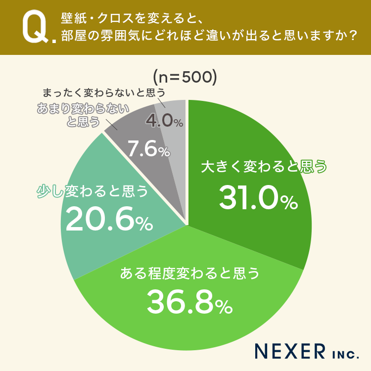 続いて、壁紙やクロスを変えることで部屋の雰囲気にどれほど違いが出ると思うか聞きました。