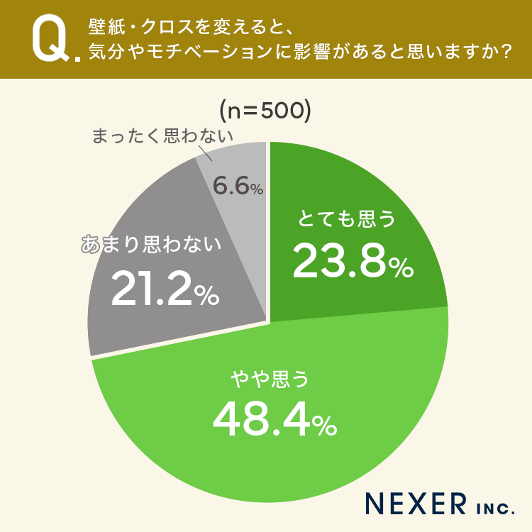 また、張り替え経験の有無にかかわらず、約9割の方が壁紙を変えると部屋の雰囲気が変わると考えており、7割以上が気分やモチベーションへの影響を感じています。