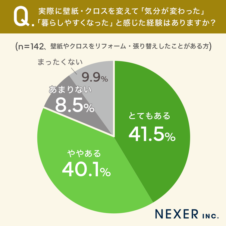 今回の調査では、持ち家に住む方の約3割が壁紙の張り替えを経験しており、そのうち8割以上が「気分が変わった」「暮らしやすくなった」と実感していることがわかりました。